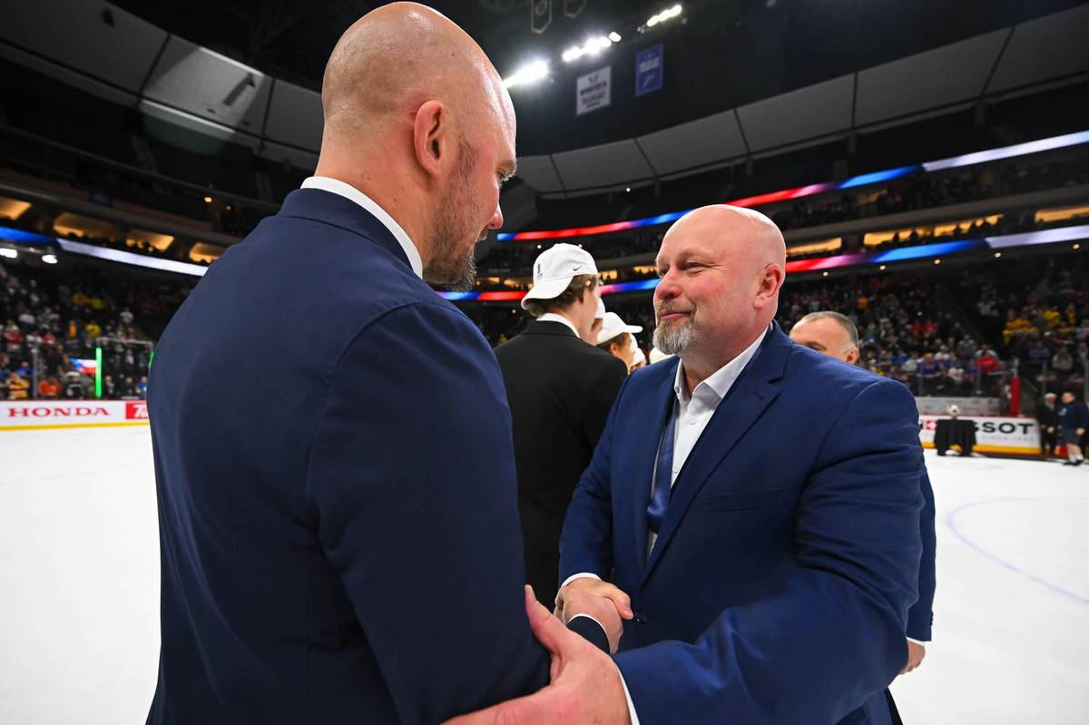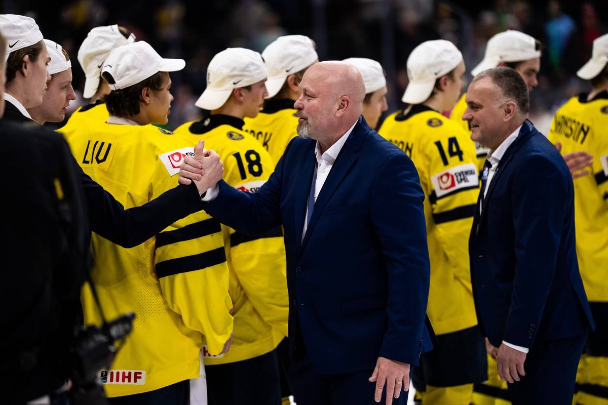 Trenér Patrik Augusta blahopřeje Švédům k titulu.