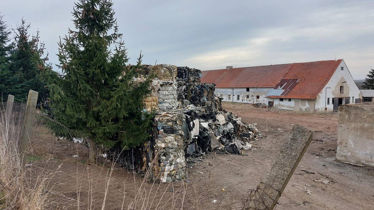 Několik metrů vysoké balíky odpadu na dvoře JZD.