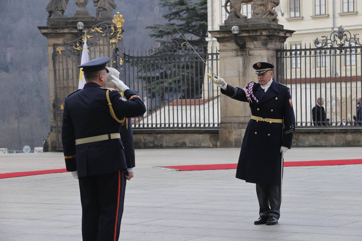 Prezident Petr Pavel přijímá hlášení od velitele Hradní stráže