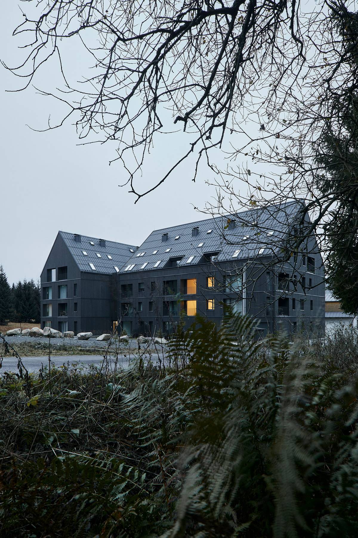 Dům tvoří dva velké propojené objekty.