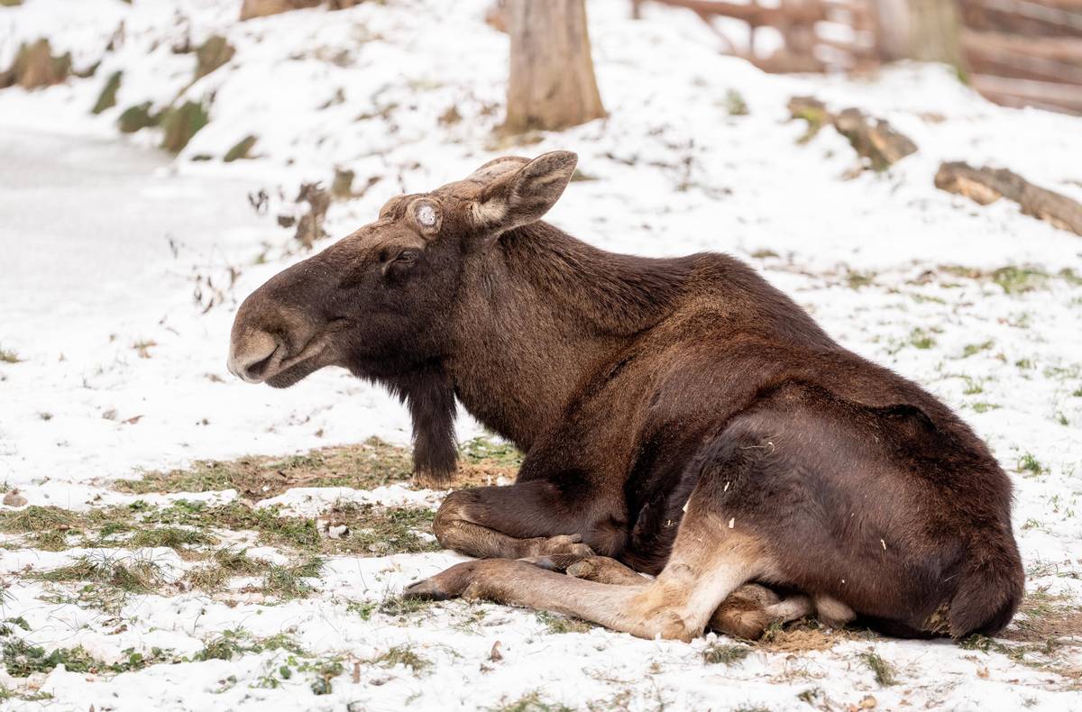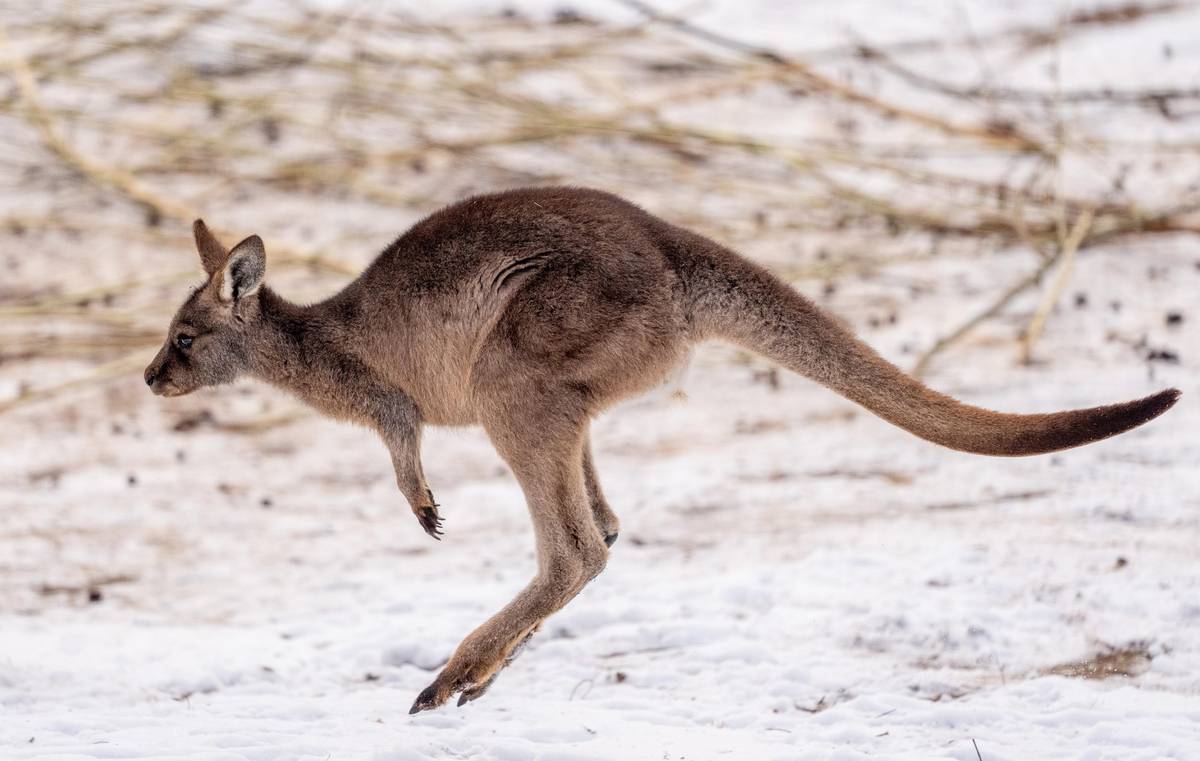 Klokanům obrovským to skáče i v zimě, i když tento mladý obrovský teprve bude.