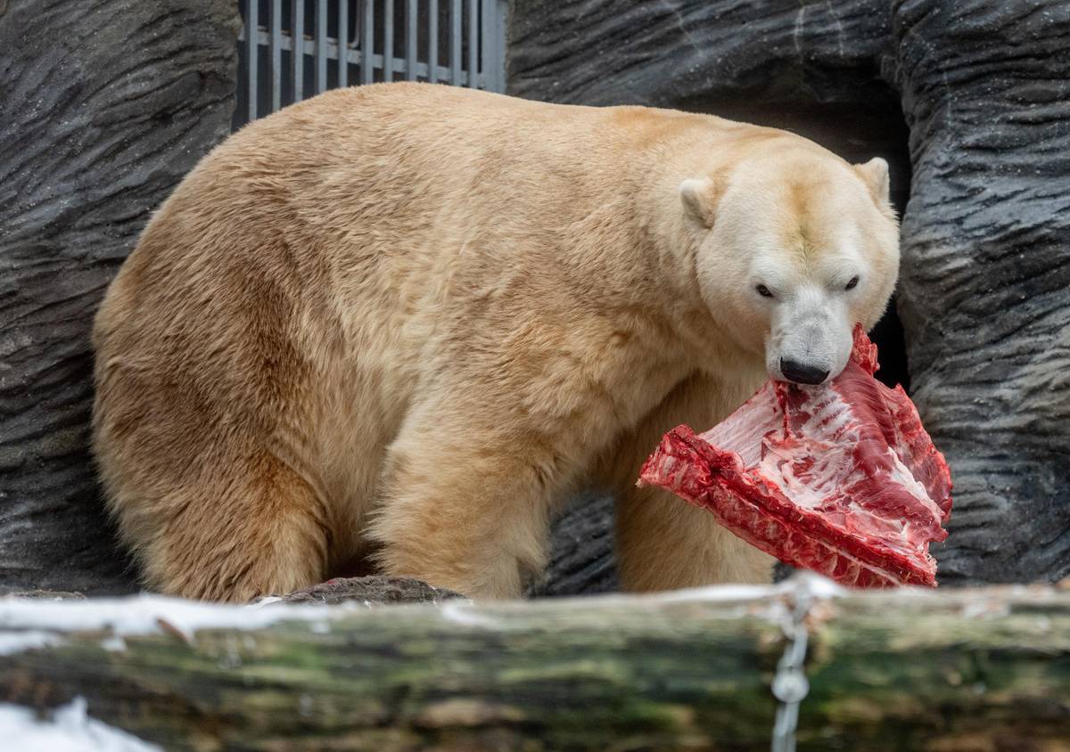 Lední medvěd sní 15 kilo masa denně. Dopoledne měl vepřové, odpoledne ještě králíka.