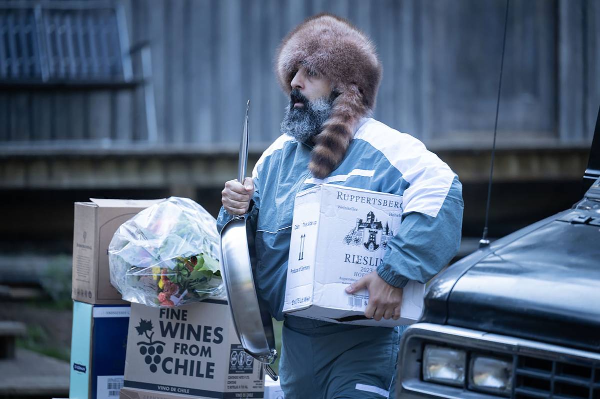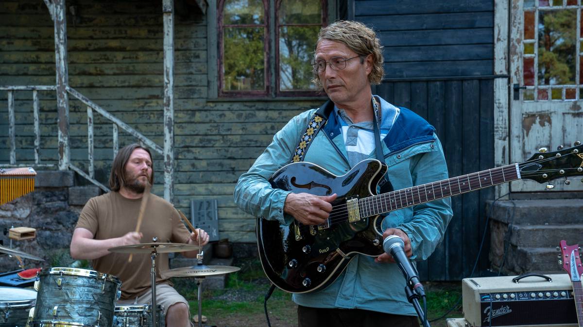 Mads Mikkelsen si jako Manfred představuje, že je slavným muzikantem Johnem Lennonem.