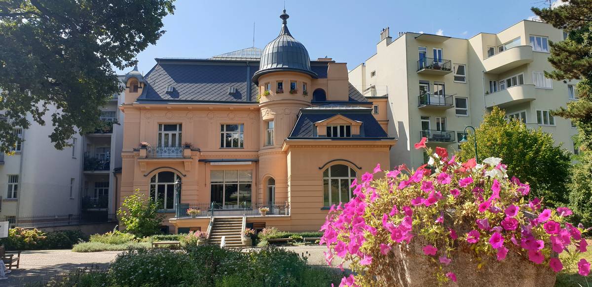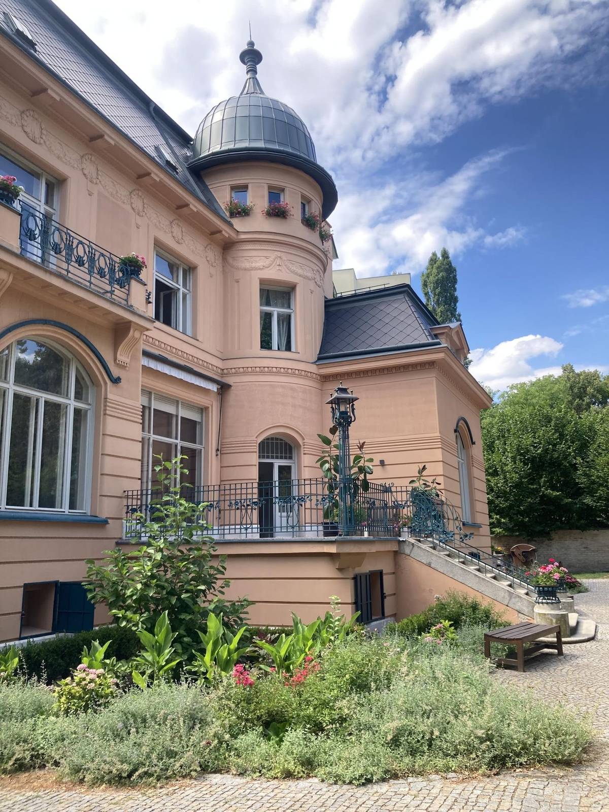 Při pohledu ze zahrady má stavba typickou siluetu vily.