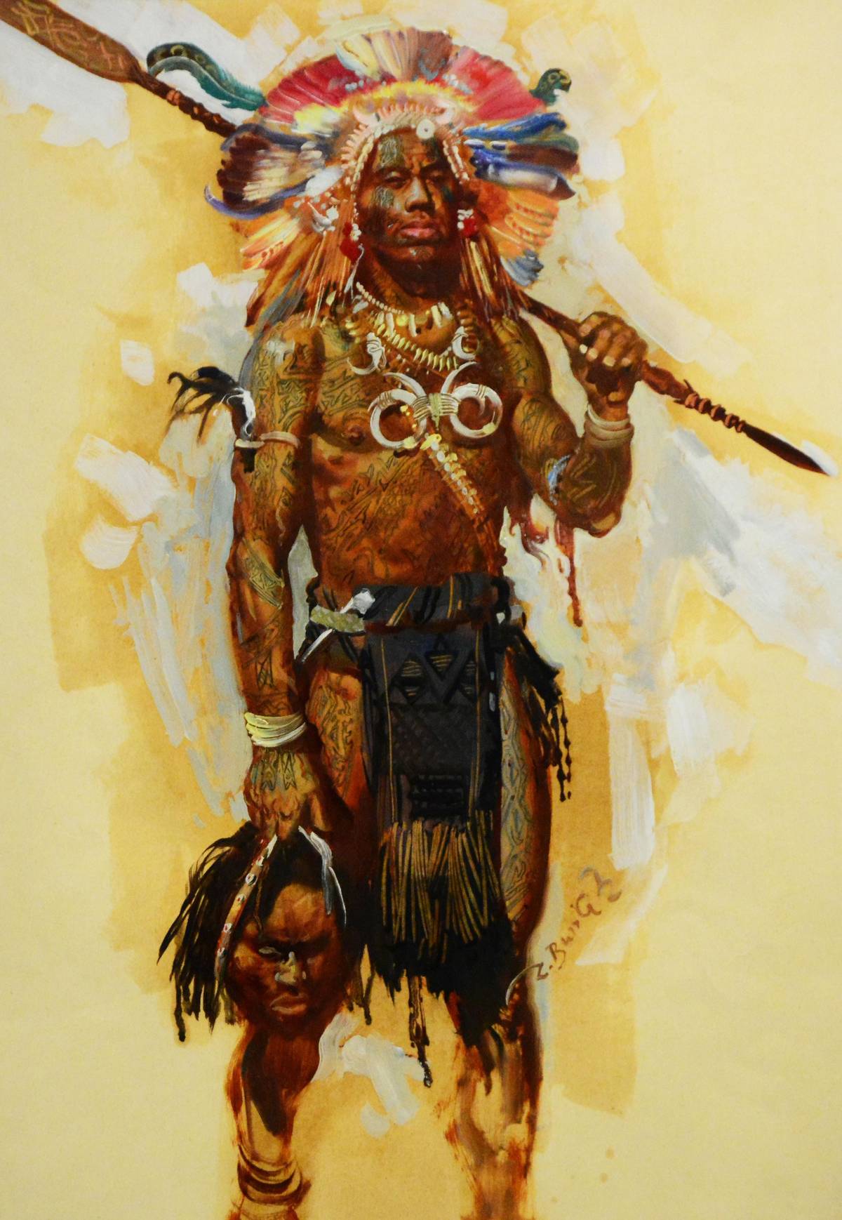 Lovec lebek s oštěpem přes rameno a trofejí v ruce