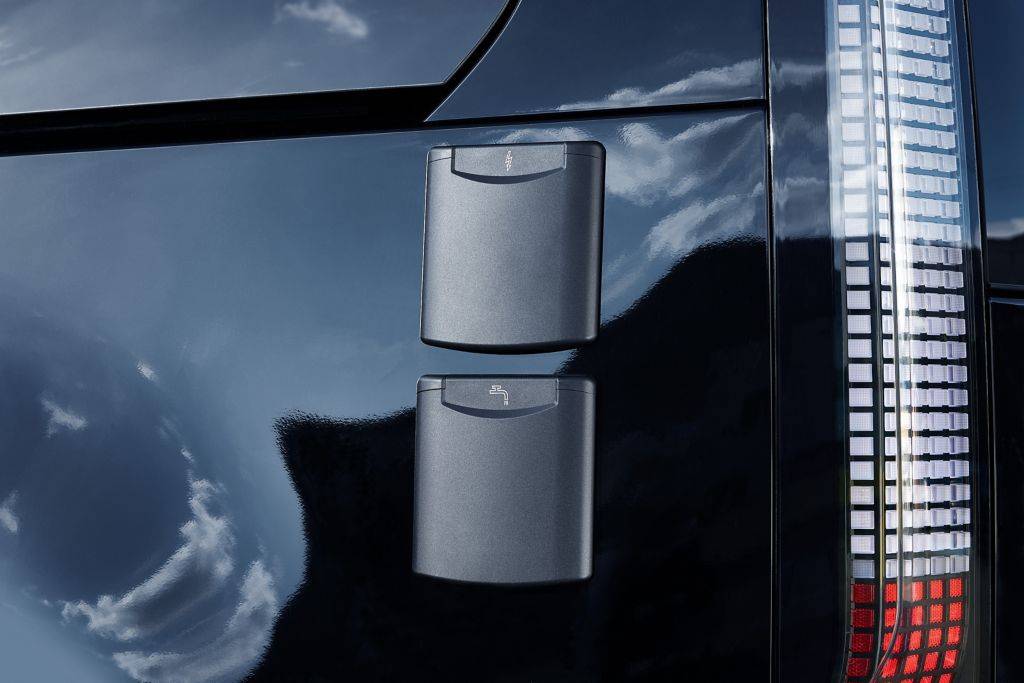 Vůz je připraven také na připojení k vodě a elektřině v kempu.