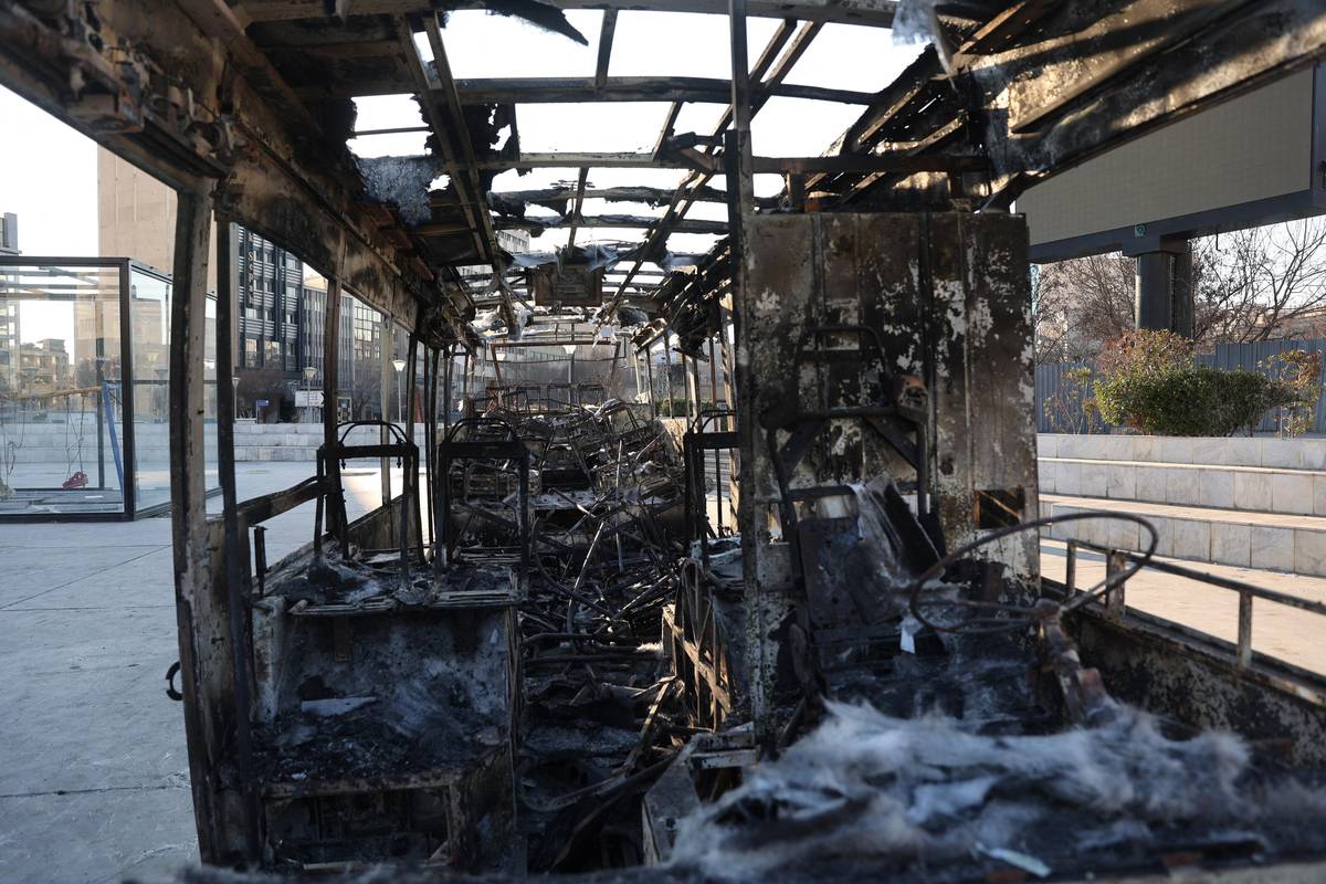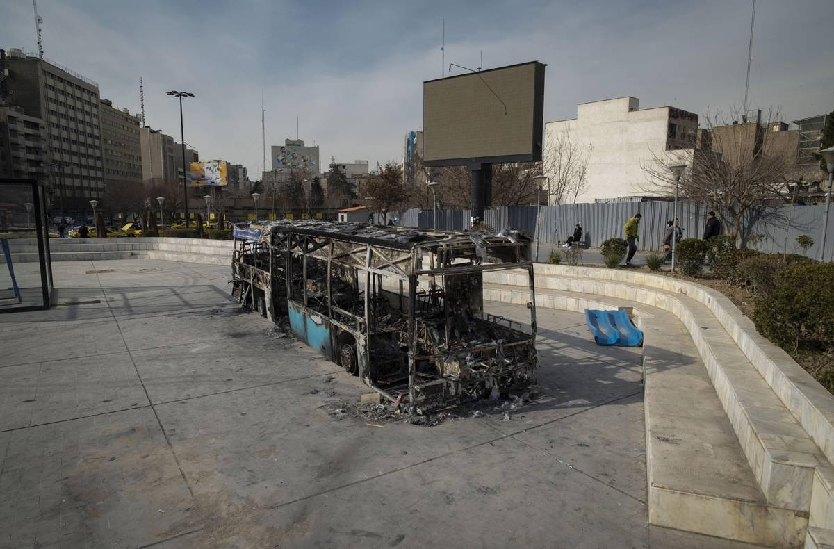 Vyhořelý autobus jako památka na protesty v Teheránu.