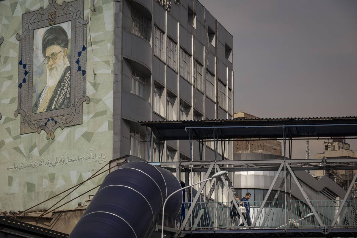 I na vyhořelý autobus shlíží z přilehlého domu nejvyšší vůdce Alí Chameneí.