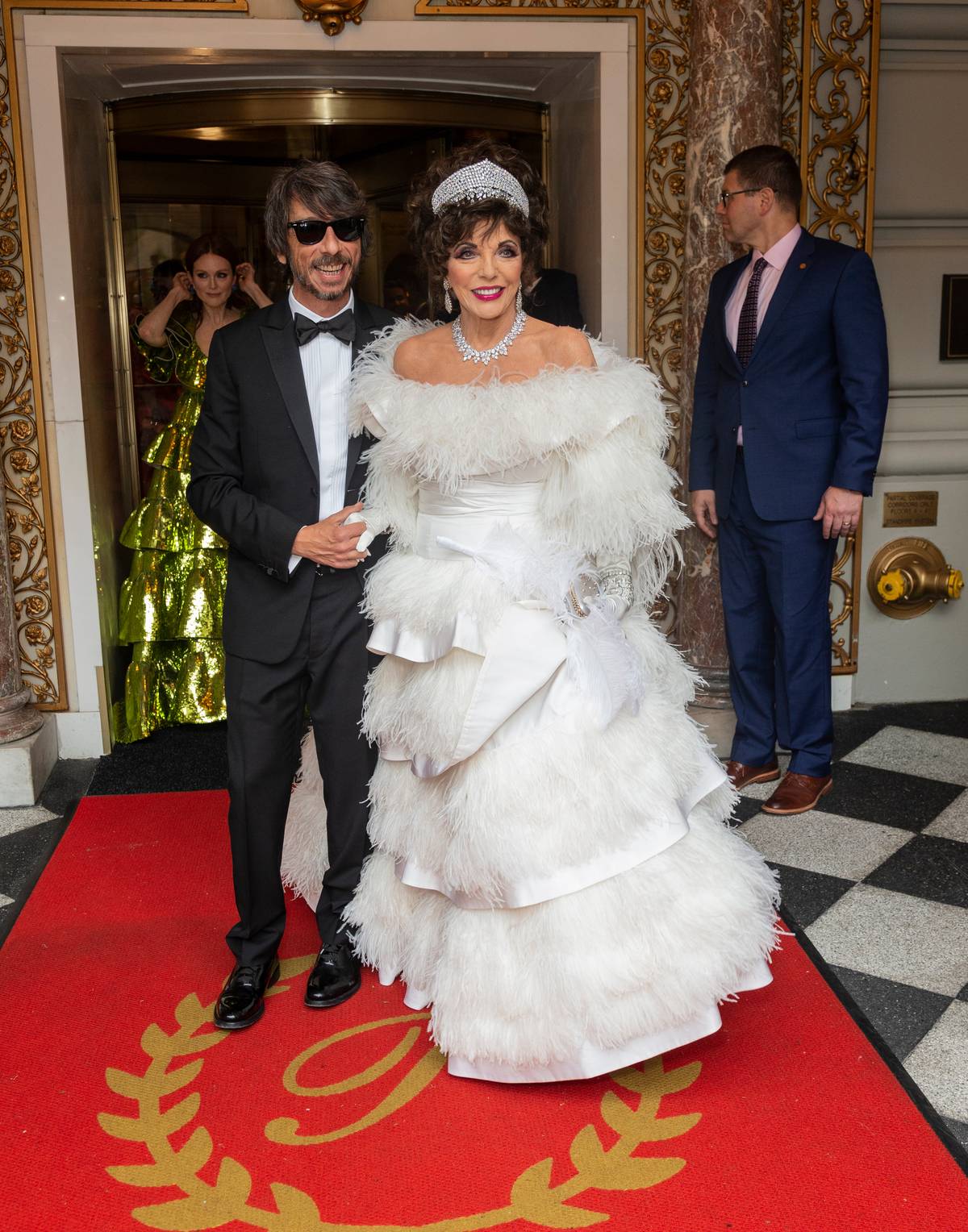 Pierpaolo Piccioli a Joan Collins v róbě Valentino opouštějí hotel The Pierre a odjíždějí na Met Gala, jehož tématem byl „Camp: Notes on Fashion“.