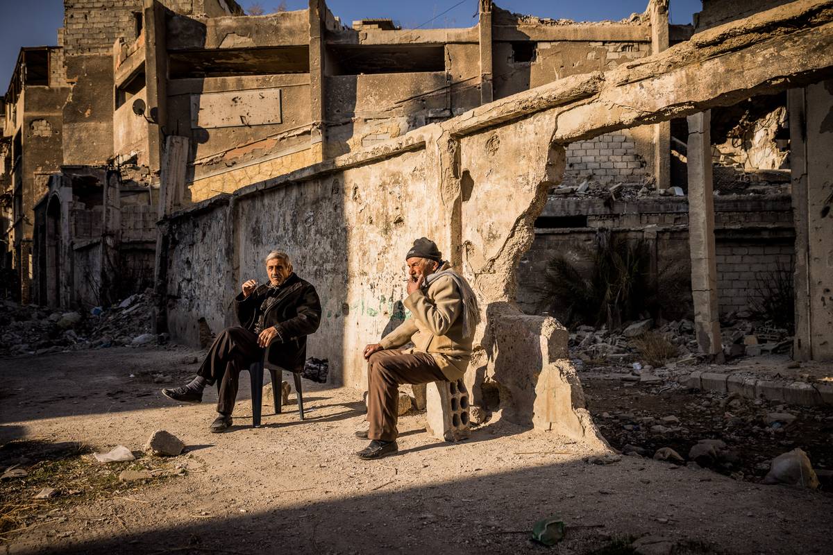 Některé domy v Jarmúku stojí celé, není v nich ale vůbec nic, okna, dveře, jakoby šlo o hrubé stavby před dokončením, popisovali v lednu reportéři z místa. Na snímku lidé v Jarmúku odpočívající během dlouhodobé práce na obnově svých domovů.