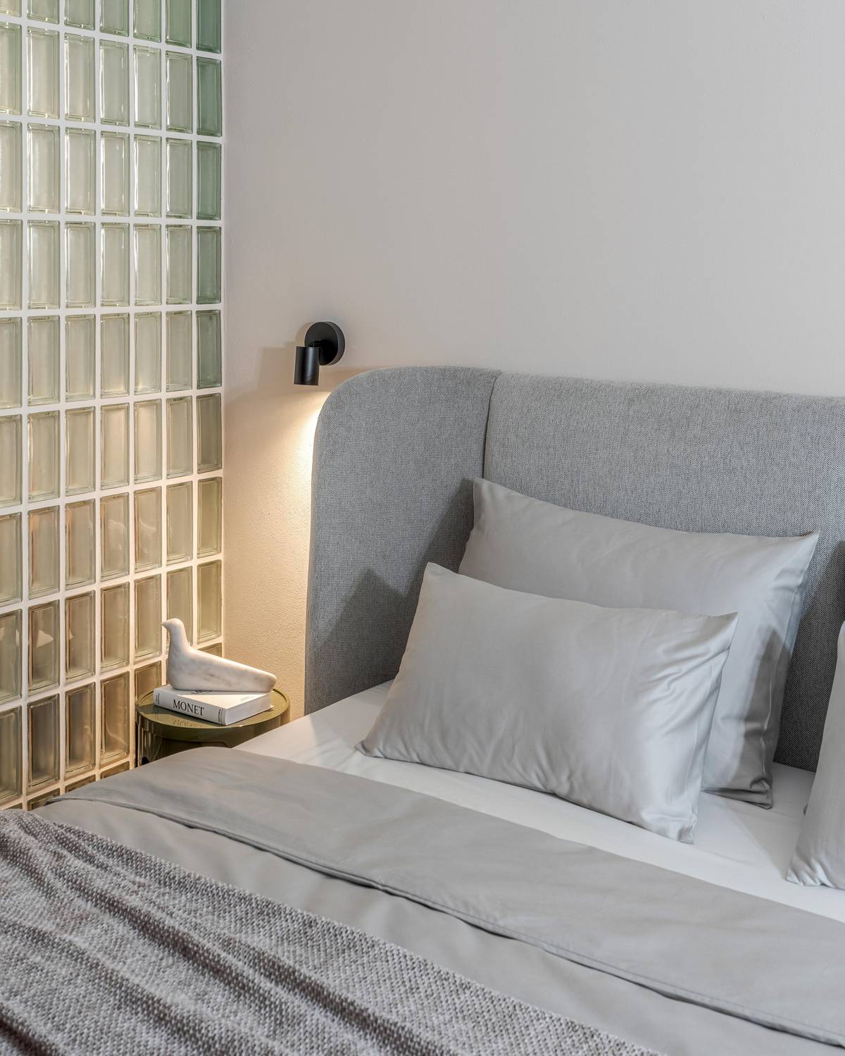 Denní světlo z oken ložnice propouští luxferová stěna dále do koupelny.
