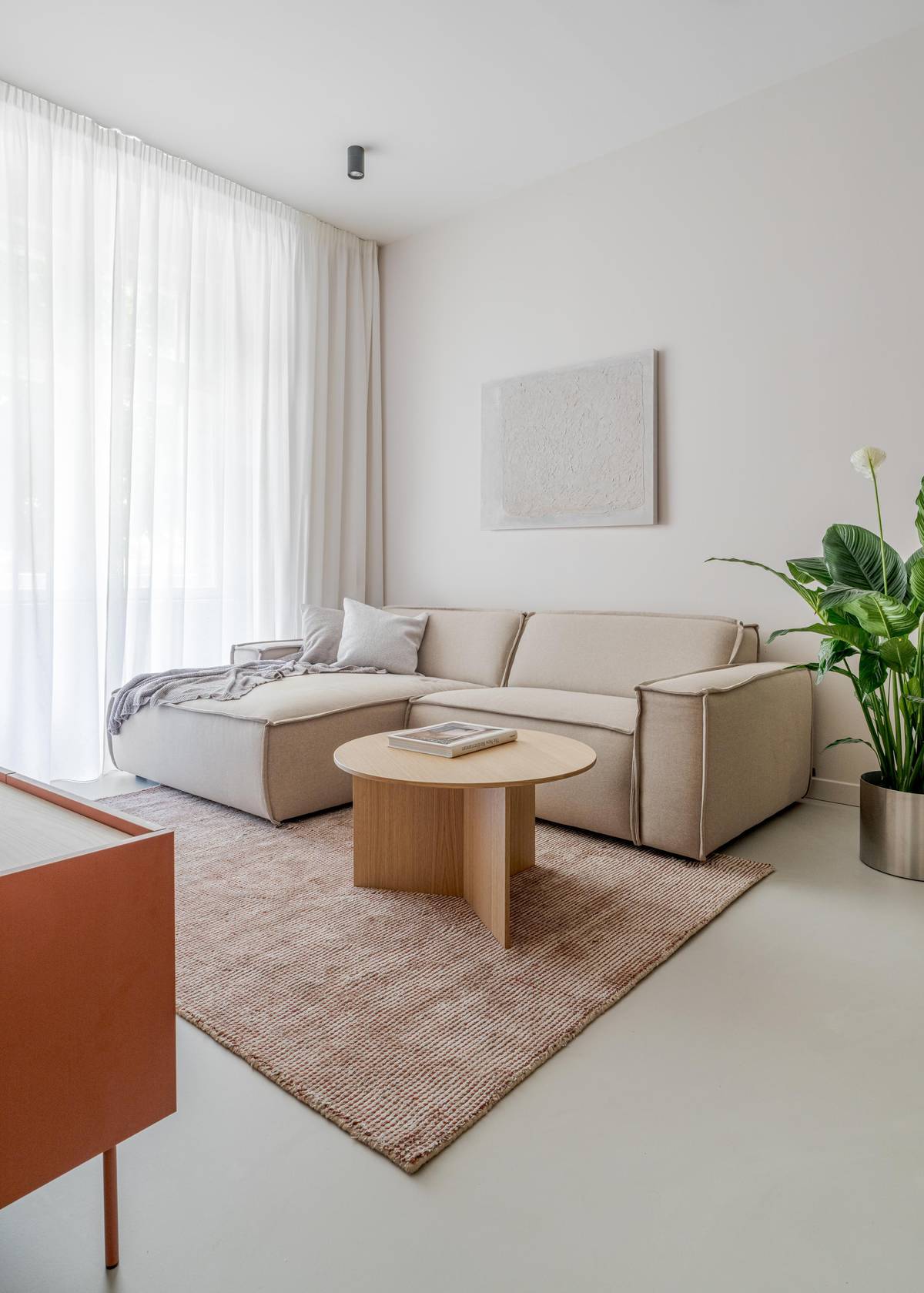 Obývací zónu definují koberec a rohová hygge pohovka v neutrálních barvách.