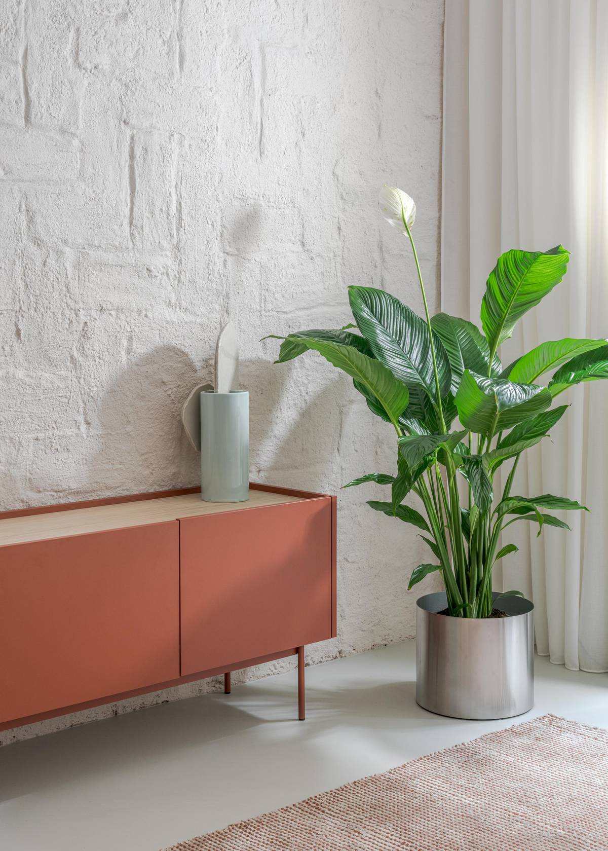 Komoda svou barvou vnáší do obývací části hřejivost. Váza Feuille je z kolekce Vases Découpage.
