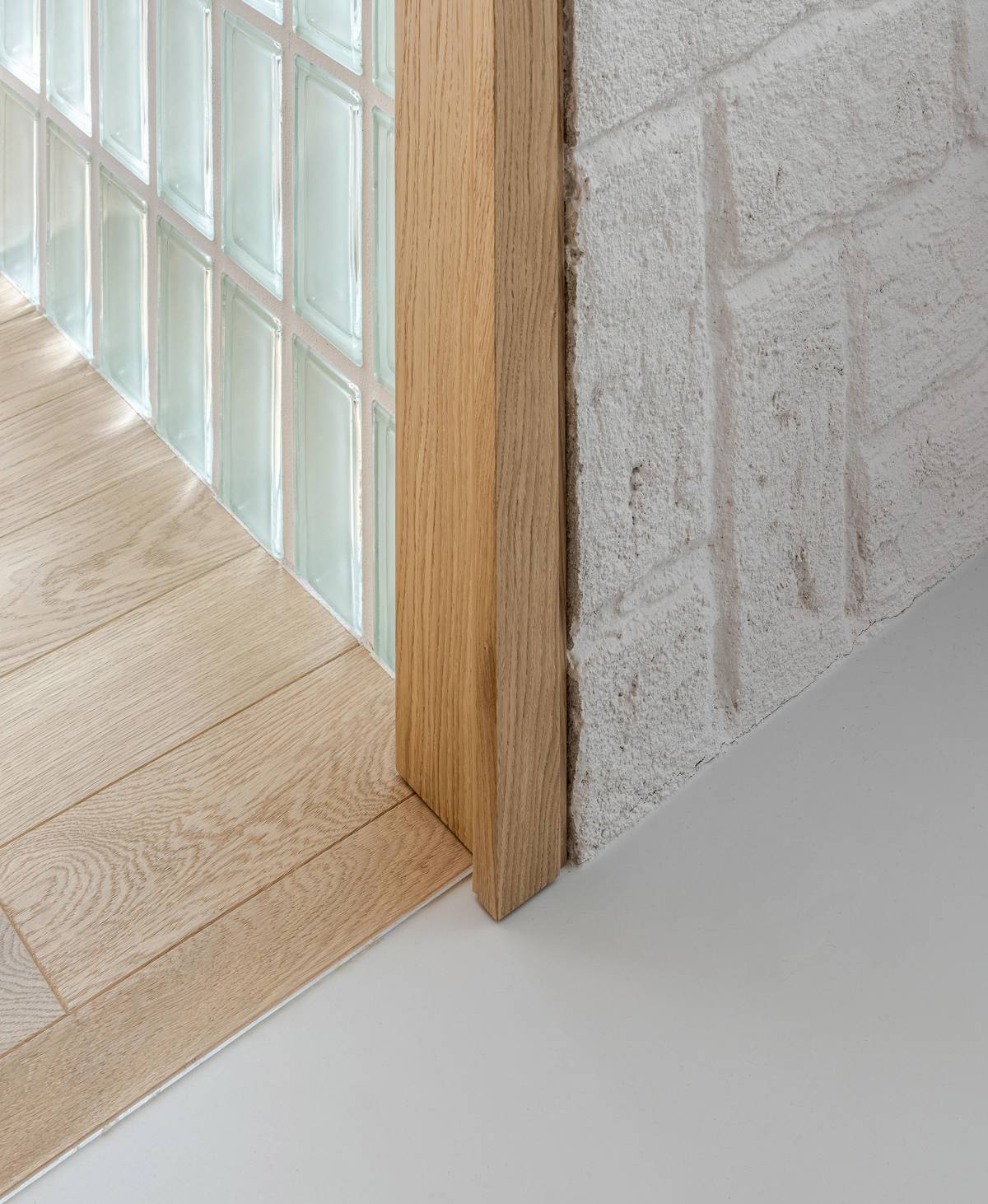 Detail kontaktu luxferové stěny, stěrky a dubové podlahy v průchodu z obýváku do ložnice.