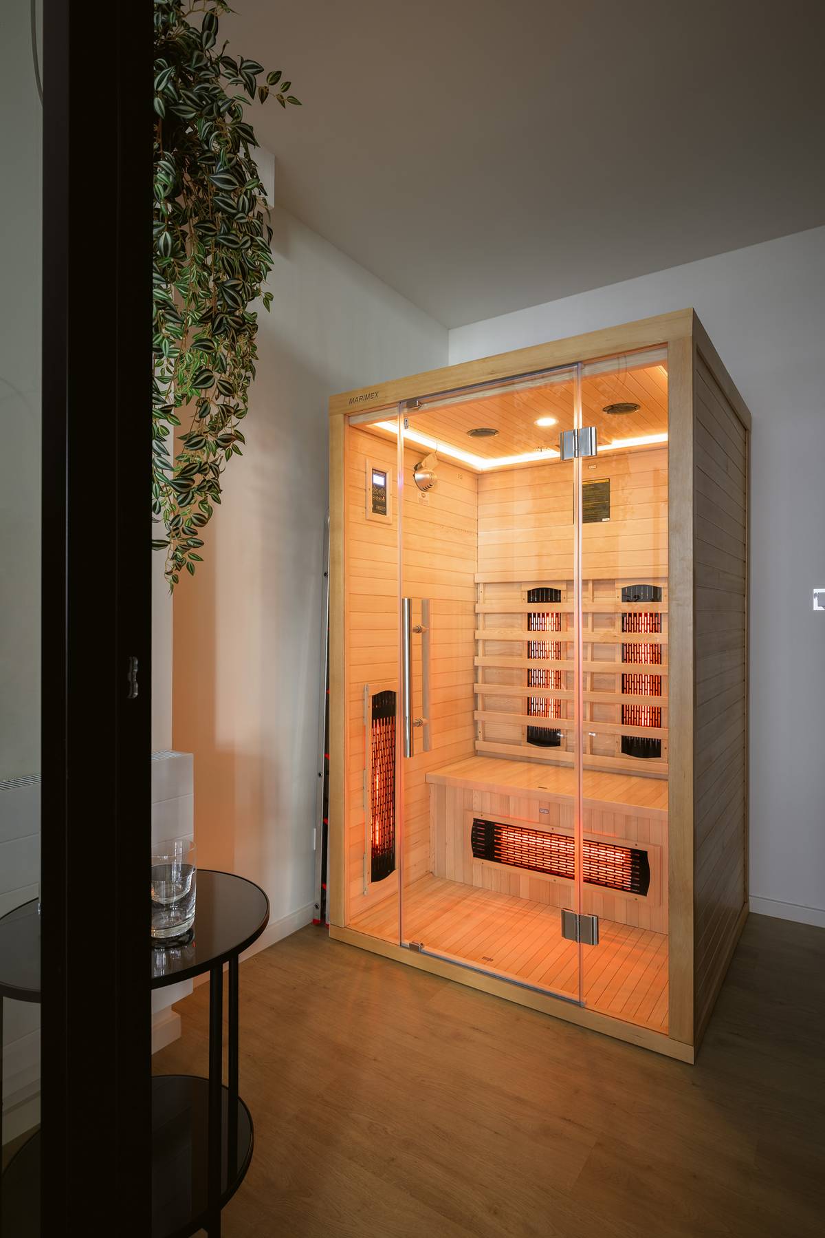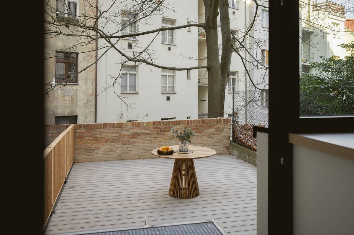 Středová místnost funguje jako malá pracovna a zároveň i soukromé wellness.