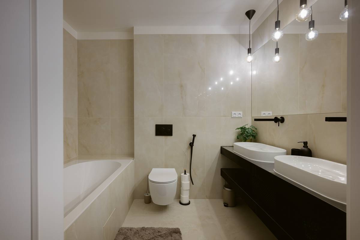 Do prostorné koupelny se vešla dvě umyvadla a vana.