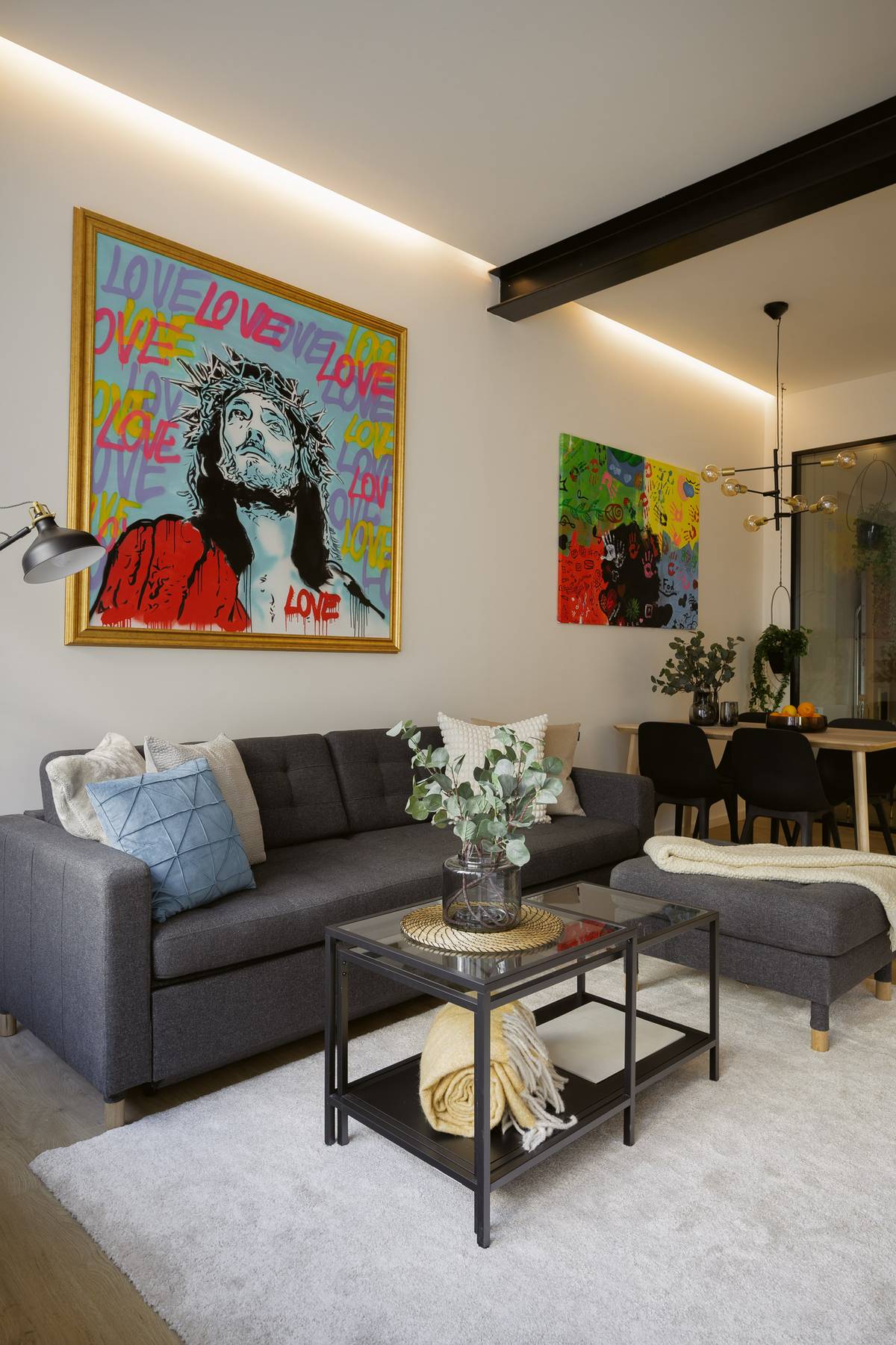 Obývacímu prostoru dominuje barevný obraz Ježíše.