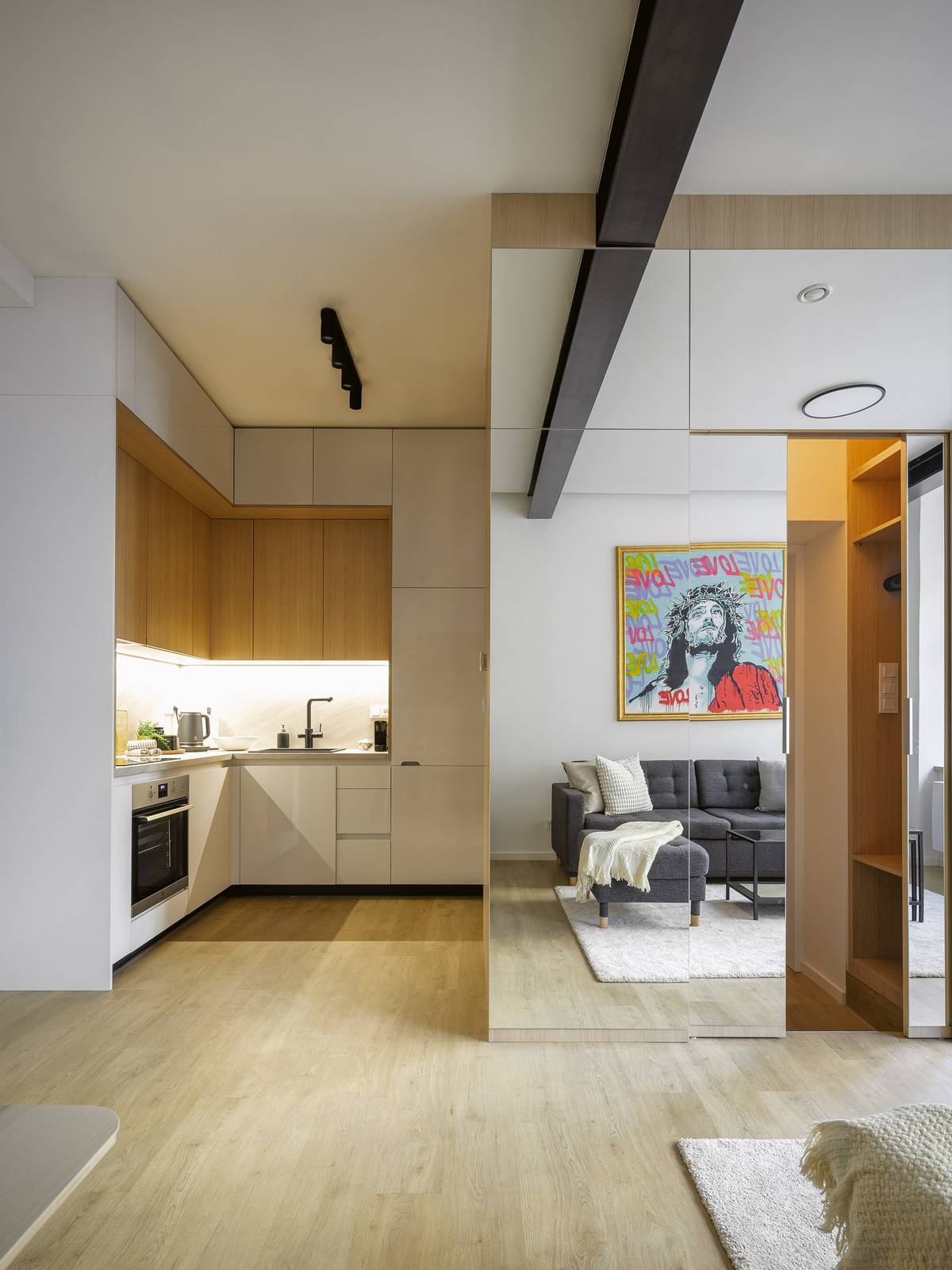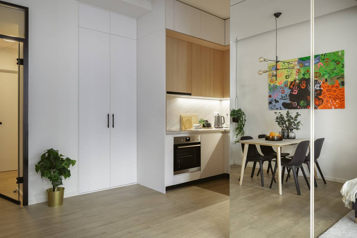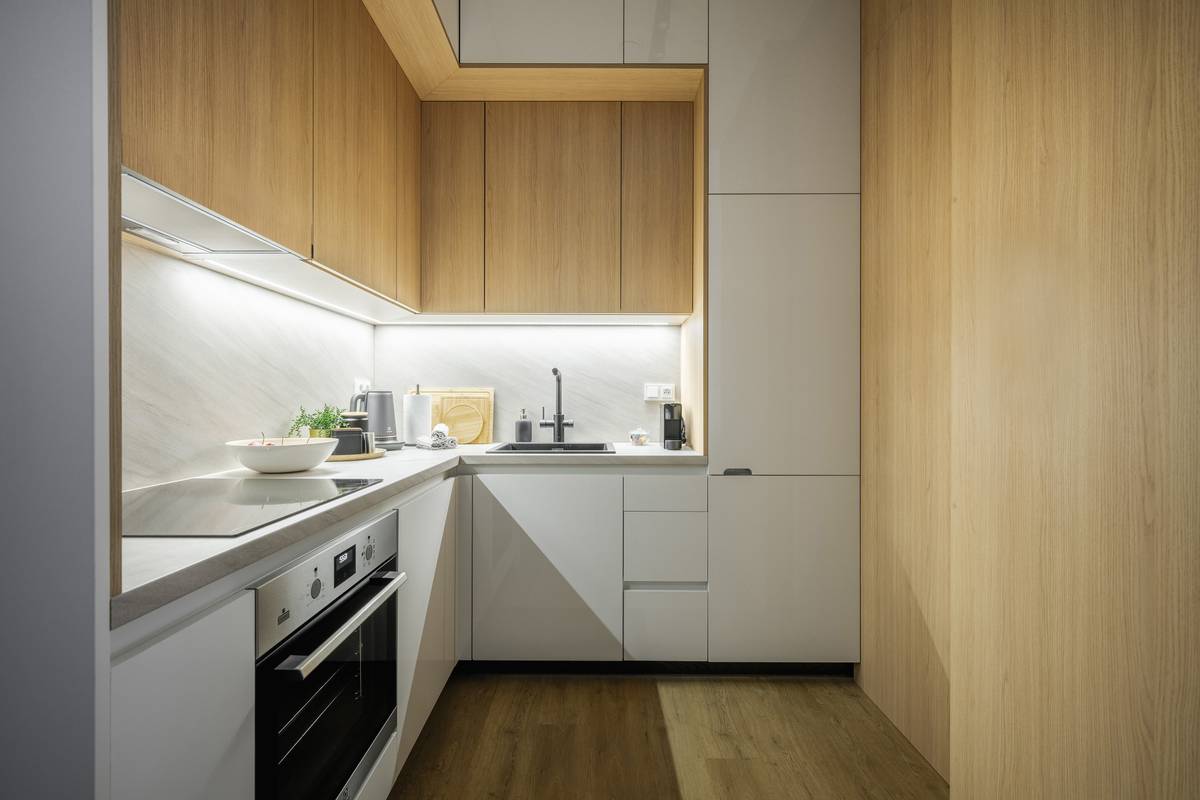 Se vstupním nábytkovým boxem sousedí kuchyňský kout.