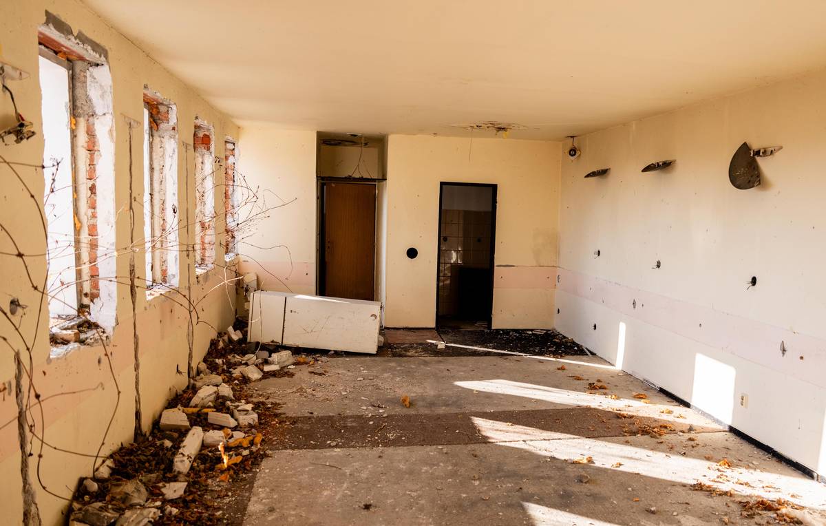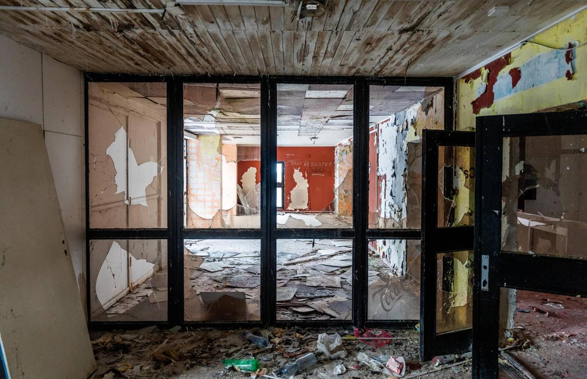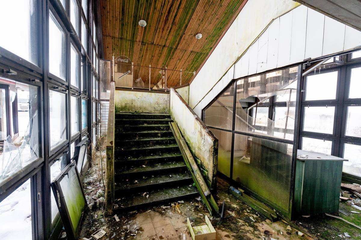 U bývalého motelu je parkoviště pro kamiony. Možná proto je uvnitř stavby obrovský nepořádek.