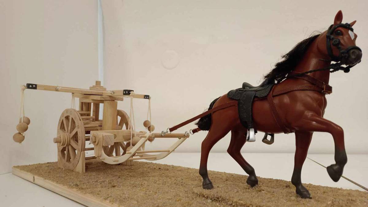 Čím rychleji jede vůz tažený koněm, tím více se nahoře roztáčí vrtule se srpy.