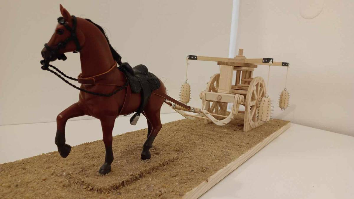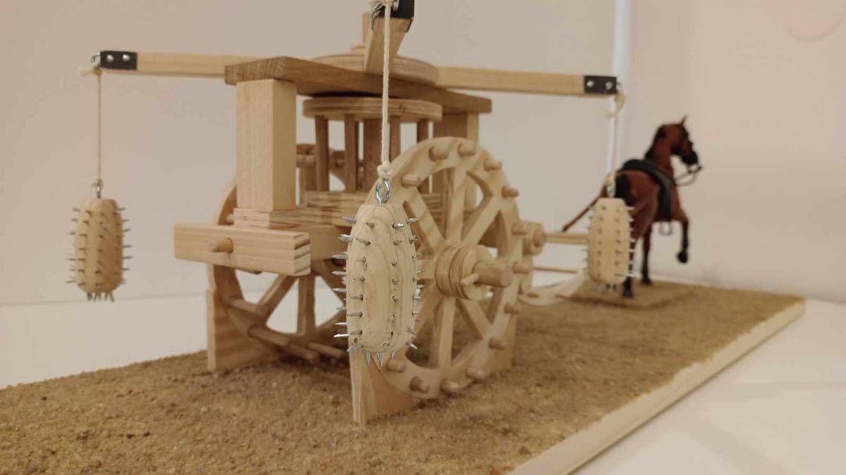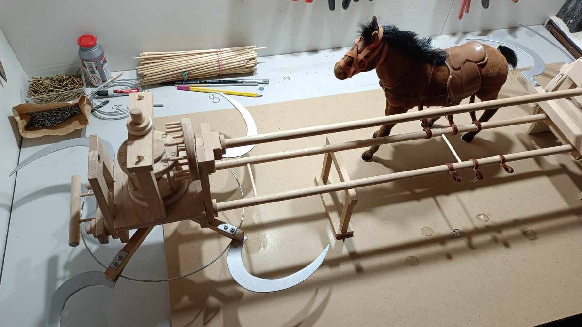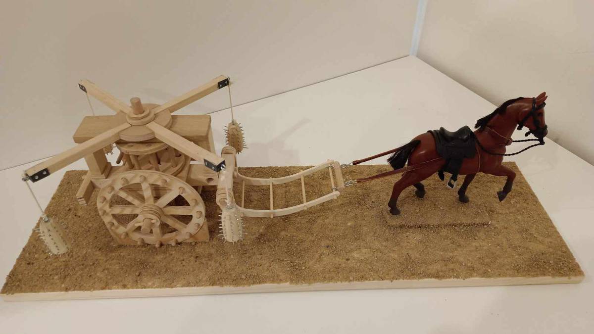 Makety ve výrobě. Je z ní vidět, že da Vinci se snažil chránit koně tím, že je umístil mezi rotující hroty.