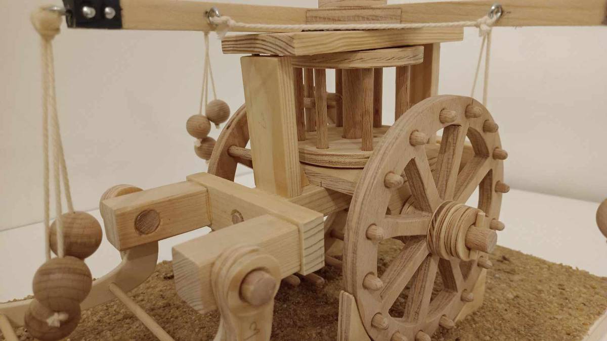 Všechny modely v expozici Leonardovy stroje jsou funkční - až na tento. Důvodem je bezpečnost dětí. Od rotujících hrotů by si mohly poranit oči.