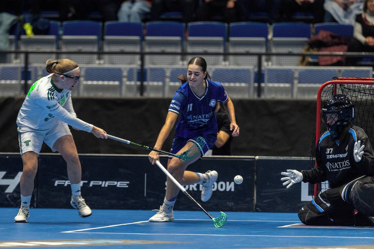 Ostrava Pohár mistrů florbalistek - finále: 1. SC Vítkovice - Thorengruppen, 24. ledna 2026, Ostrava. Zleva Mia Österbö Nilsen z Thorengruppen, Sára Seevaldová z Vítkovic a Nikola Příleská z Vítkovic.