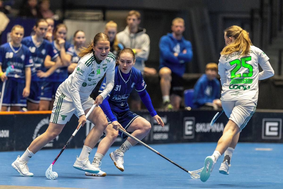 Ostrava Pohár mistrů florbalistek - finále: 1. SC Vítkovice - Thorengruppen, 24. ledna 2026, Ostrava. Zleva Veera Kauppi z Thorengruppen, Tereza Matýsková z Vítkovic a Nikola Příleská z Vítkovic.