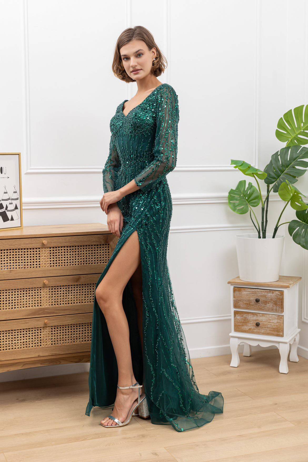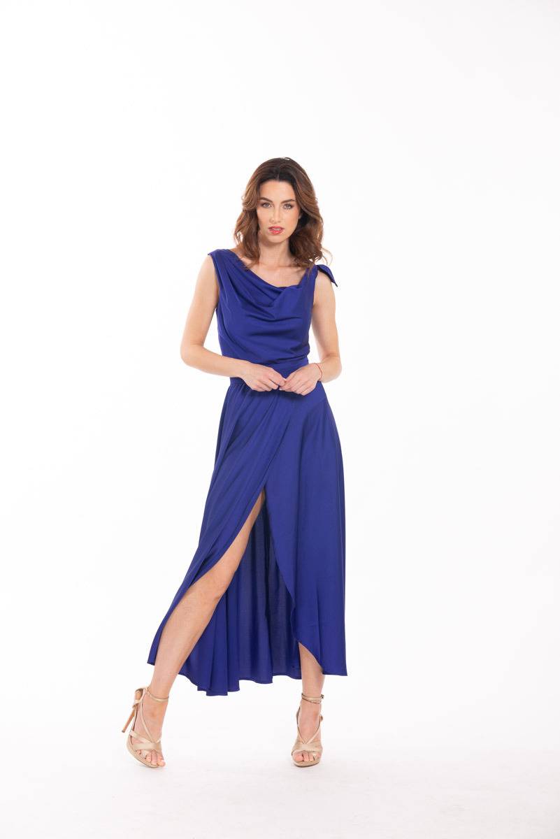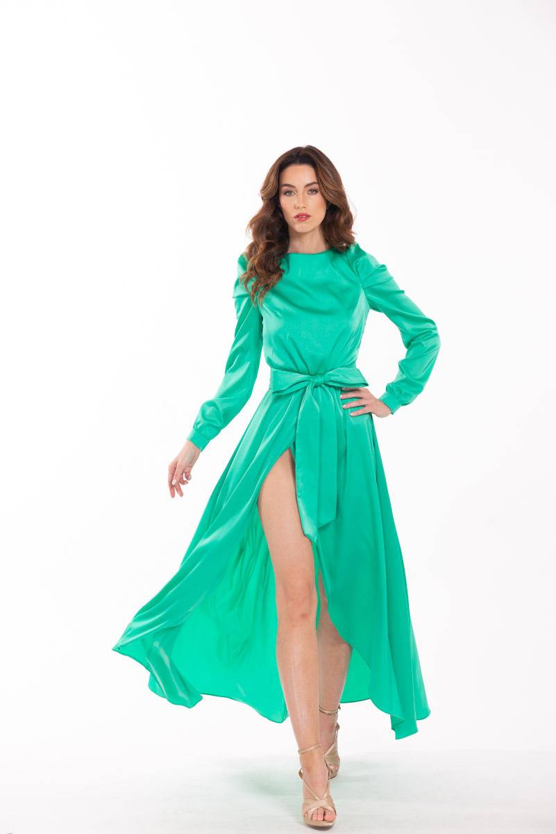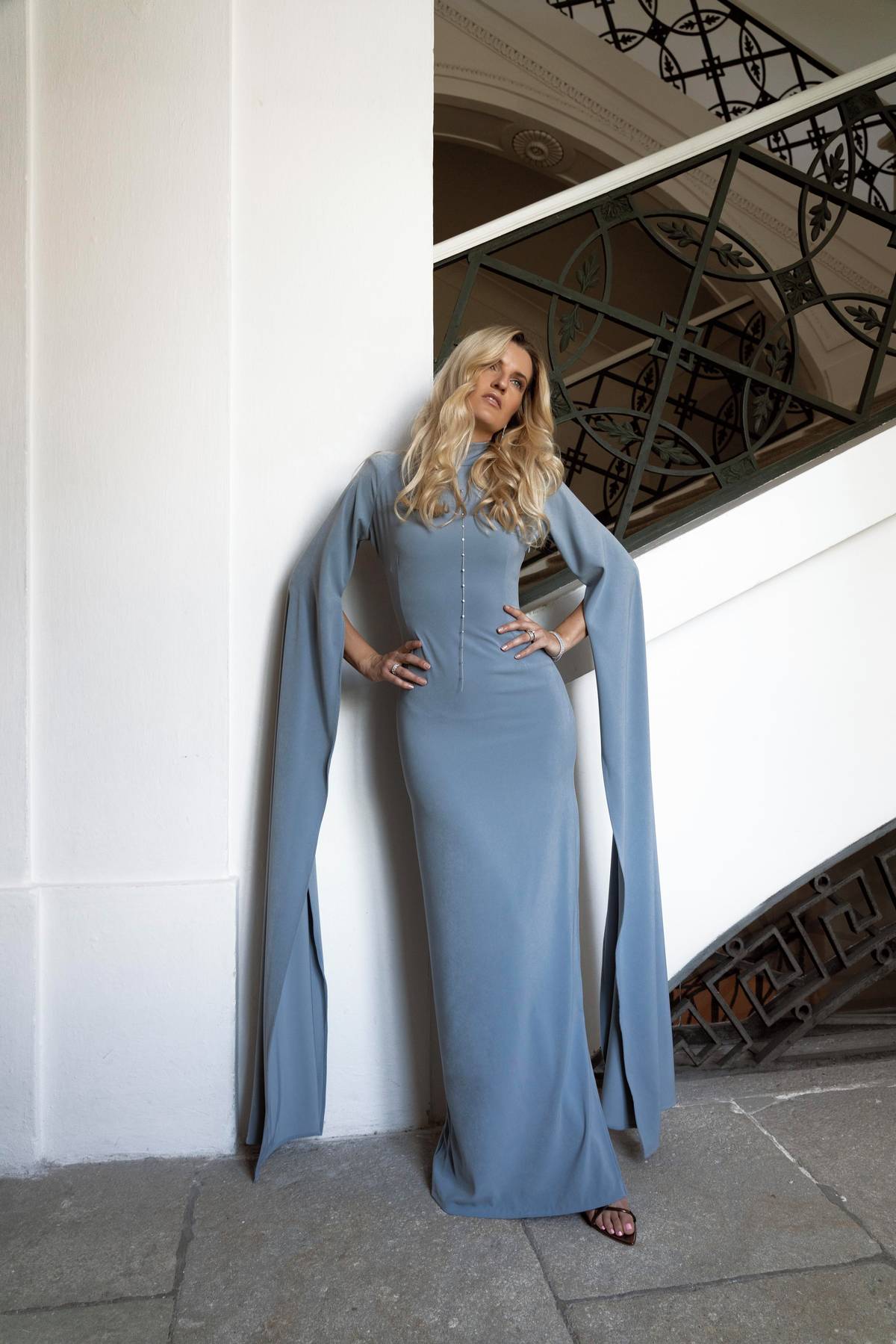 Modrošedé společenské šaty s rolákem a rukávy do vlečky, Martina Pipková Loudová, půjčovné od 12 000 Kč
