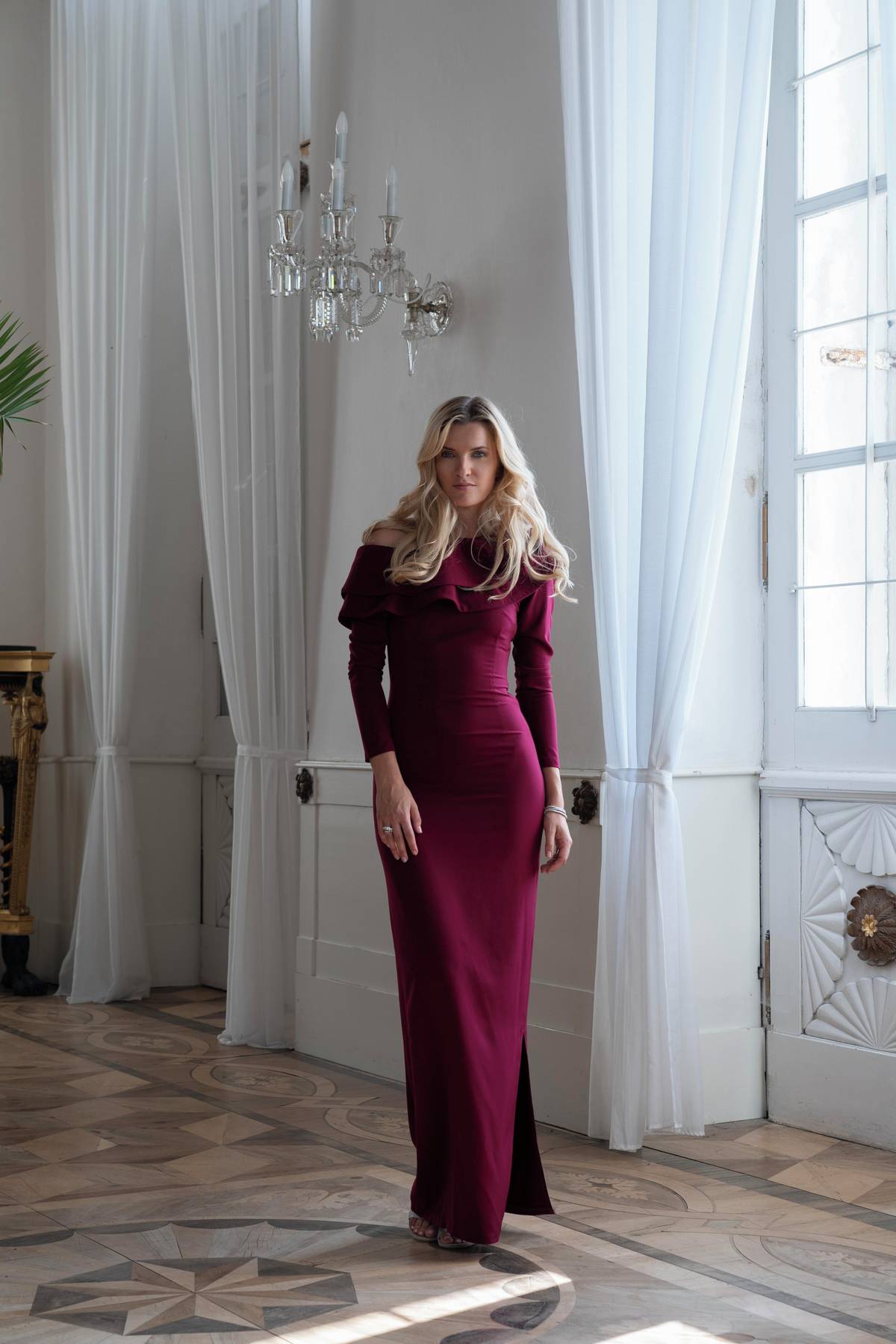 Vínové společenské šaty s volánkem, Martina Pipková Loudová, půjčovné od 12 000 Kč