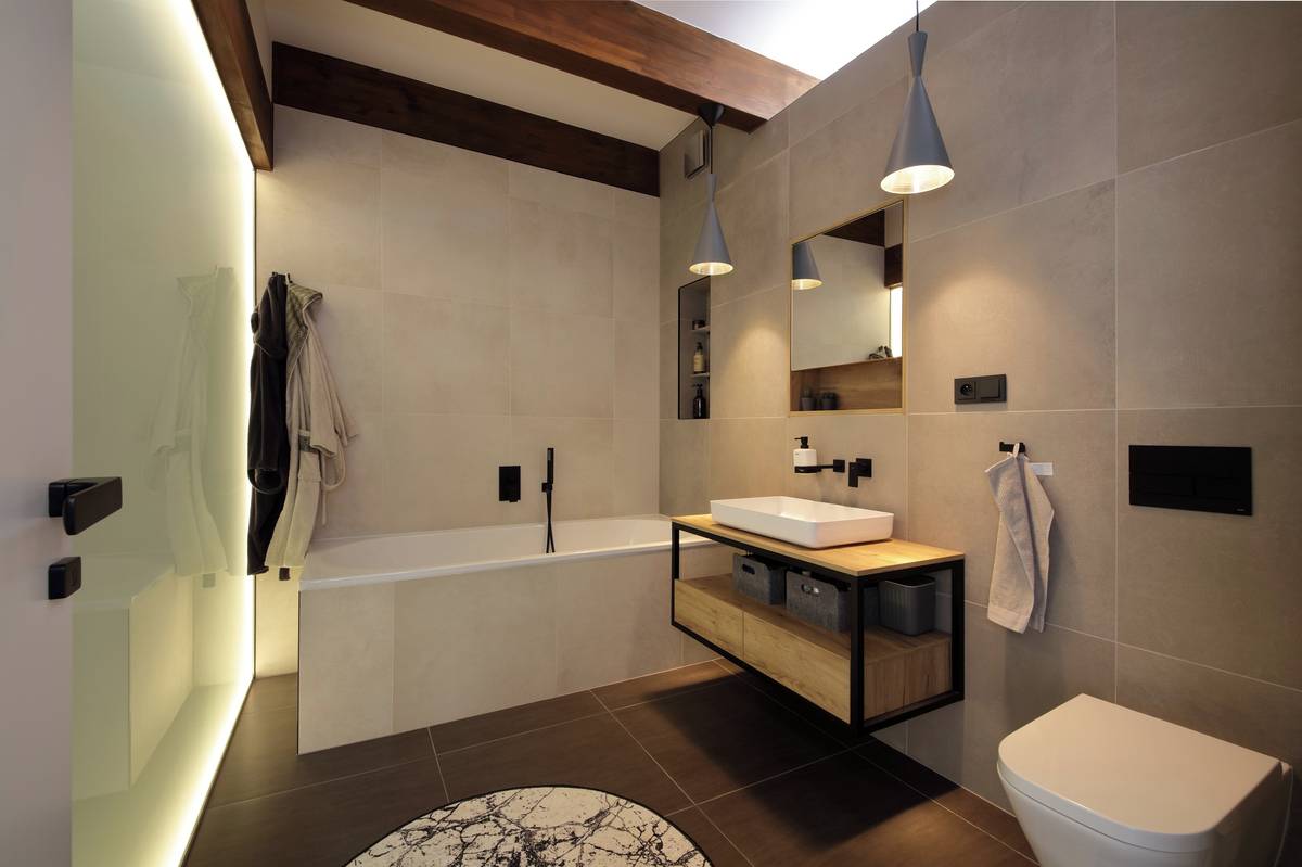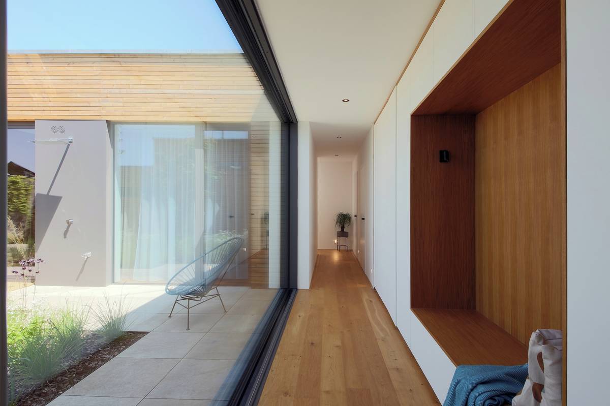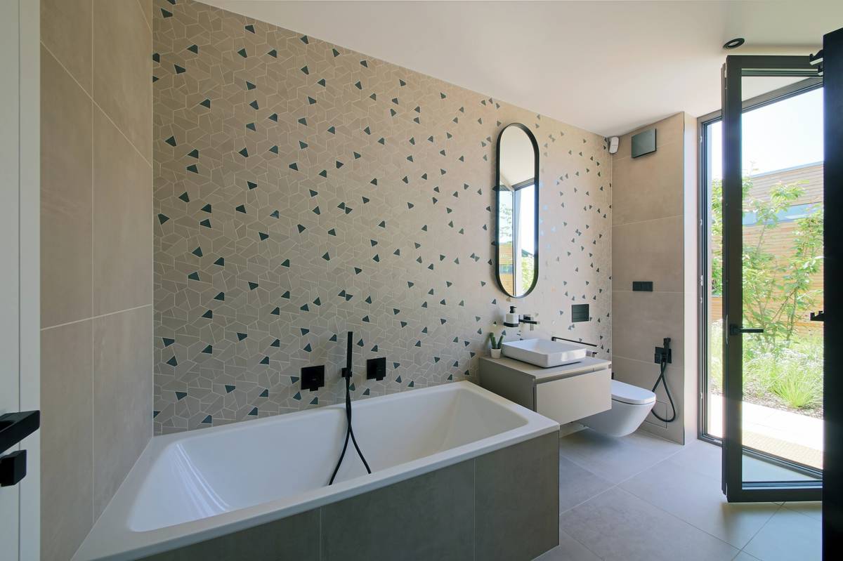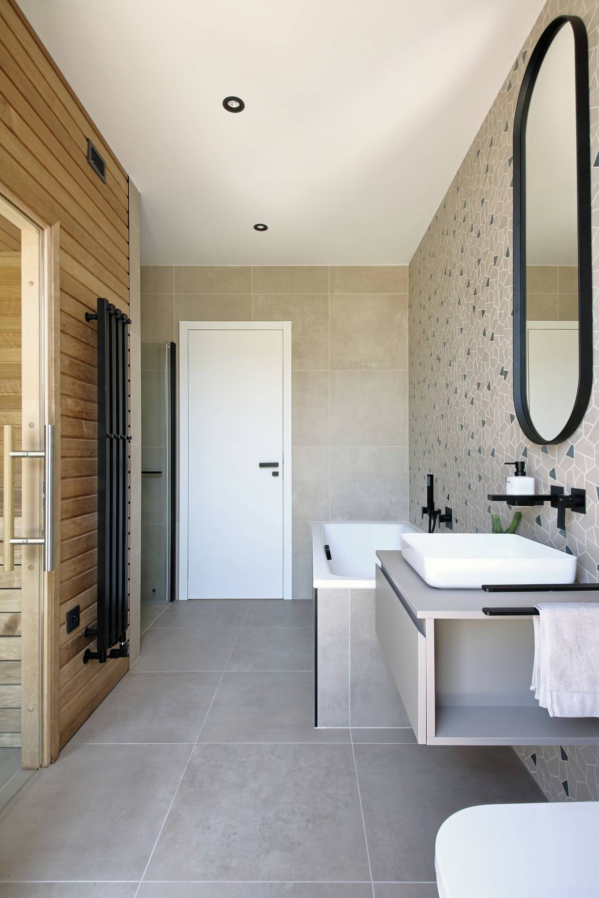 Na koupelnu v přístavbě navazuje sauna, z níž lze pak vyjít do atria.
