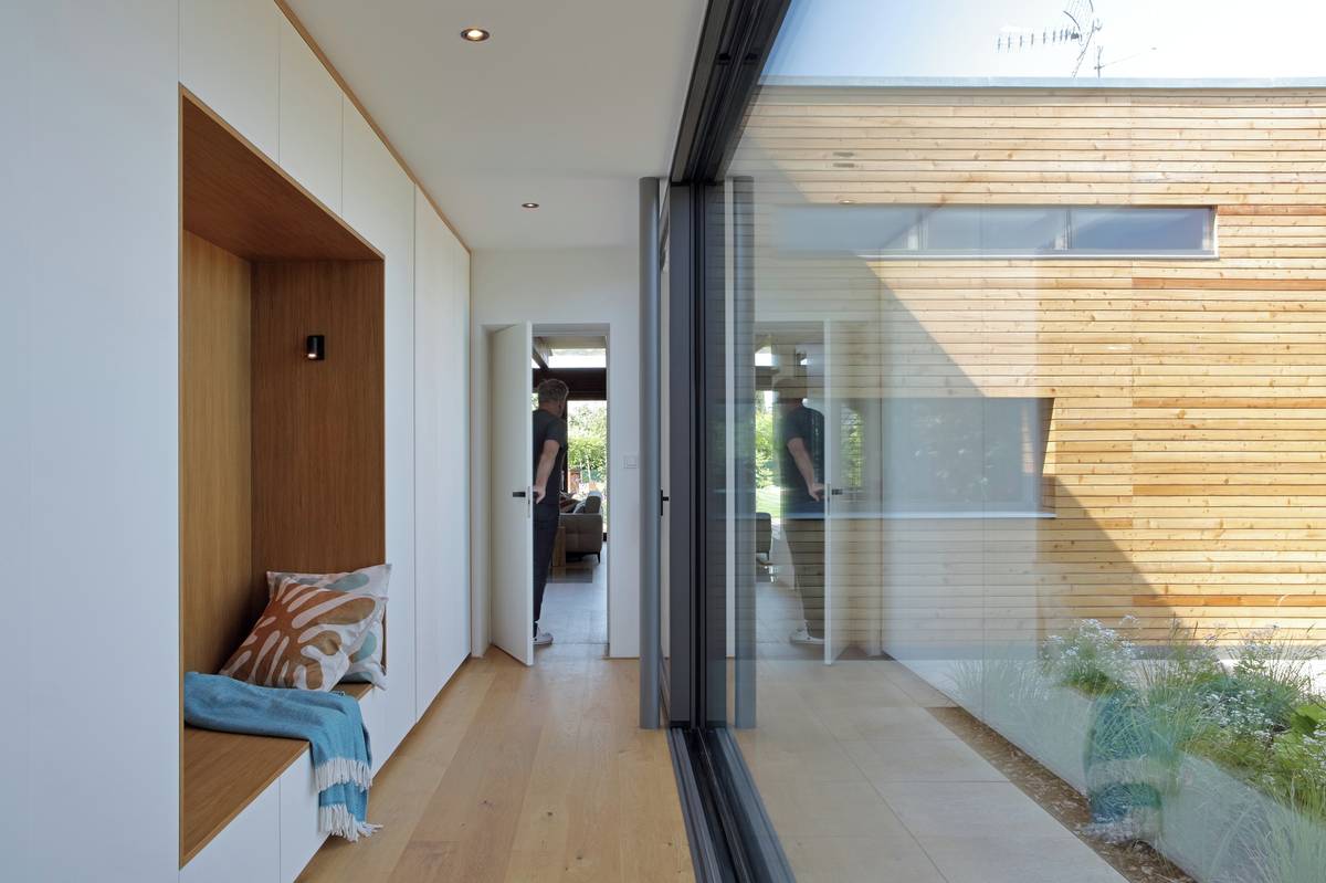 Hezkým nápadem je vytvoření niky s posezením ve spojovacím krčku mezi původním objektem a přístavbou. Lze odtud koukat do zahrady například za nepříznivého počasí a přitom zůstávat pěkně v teple domova.
