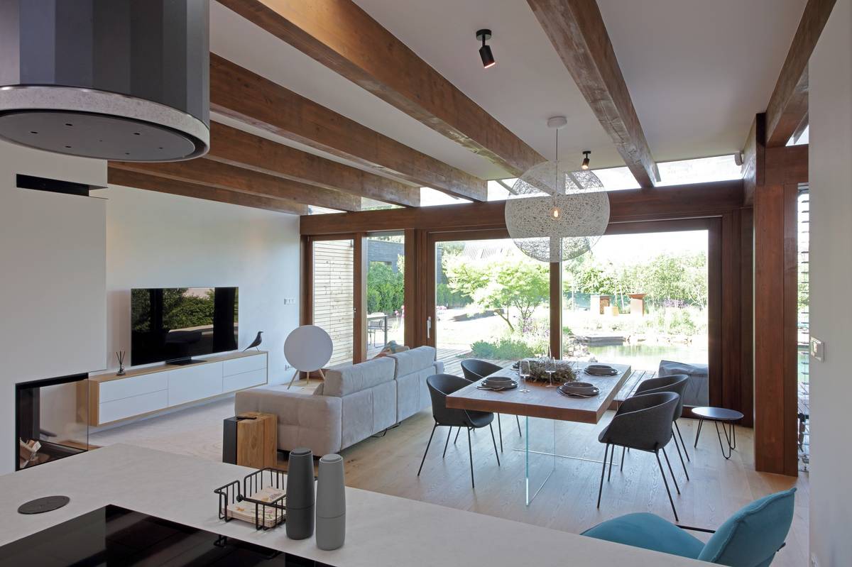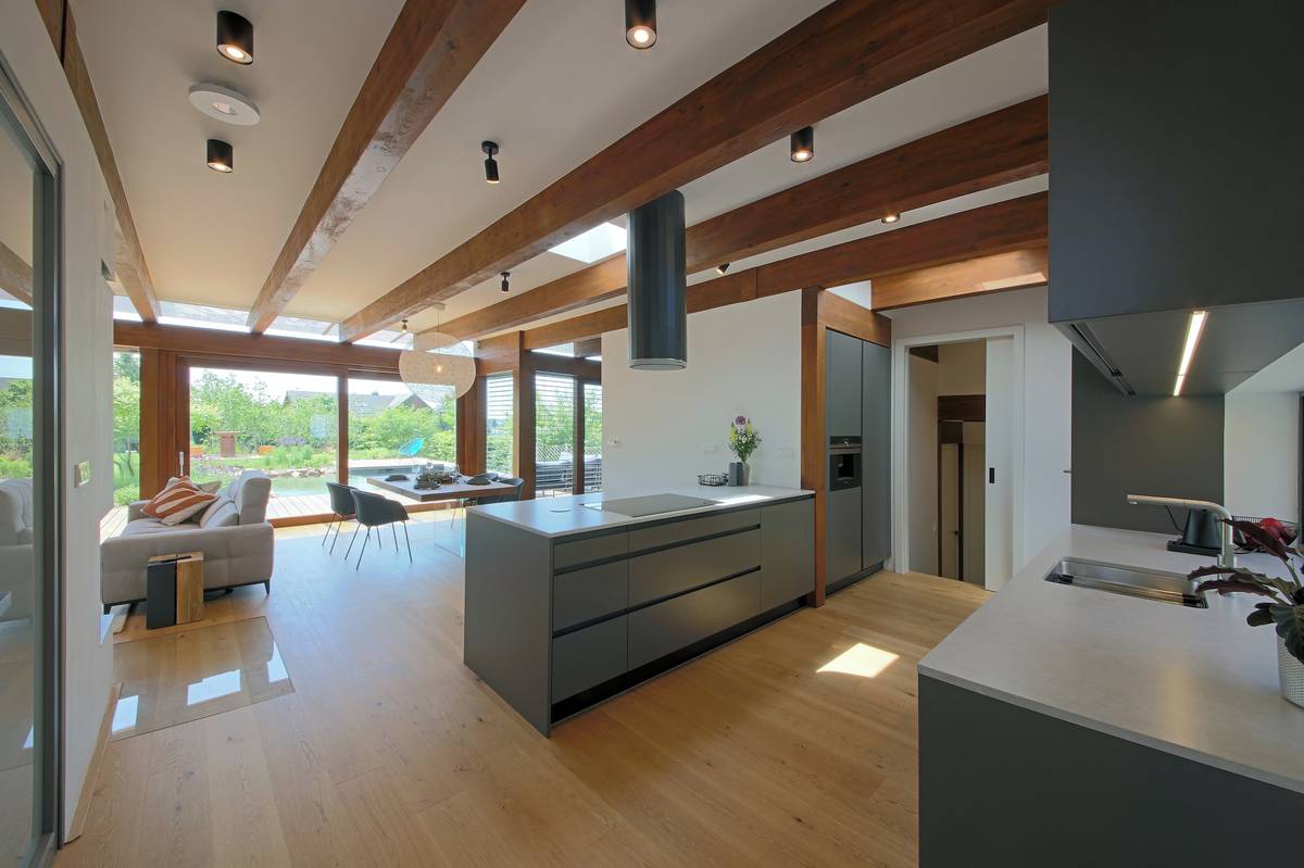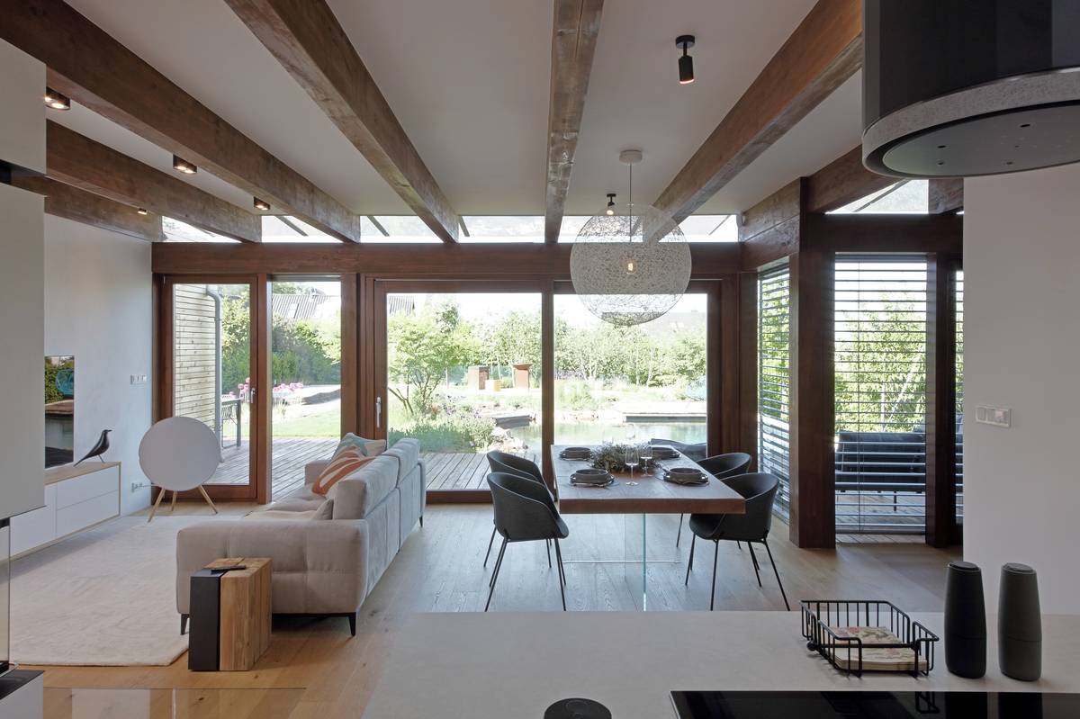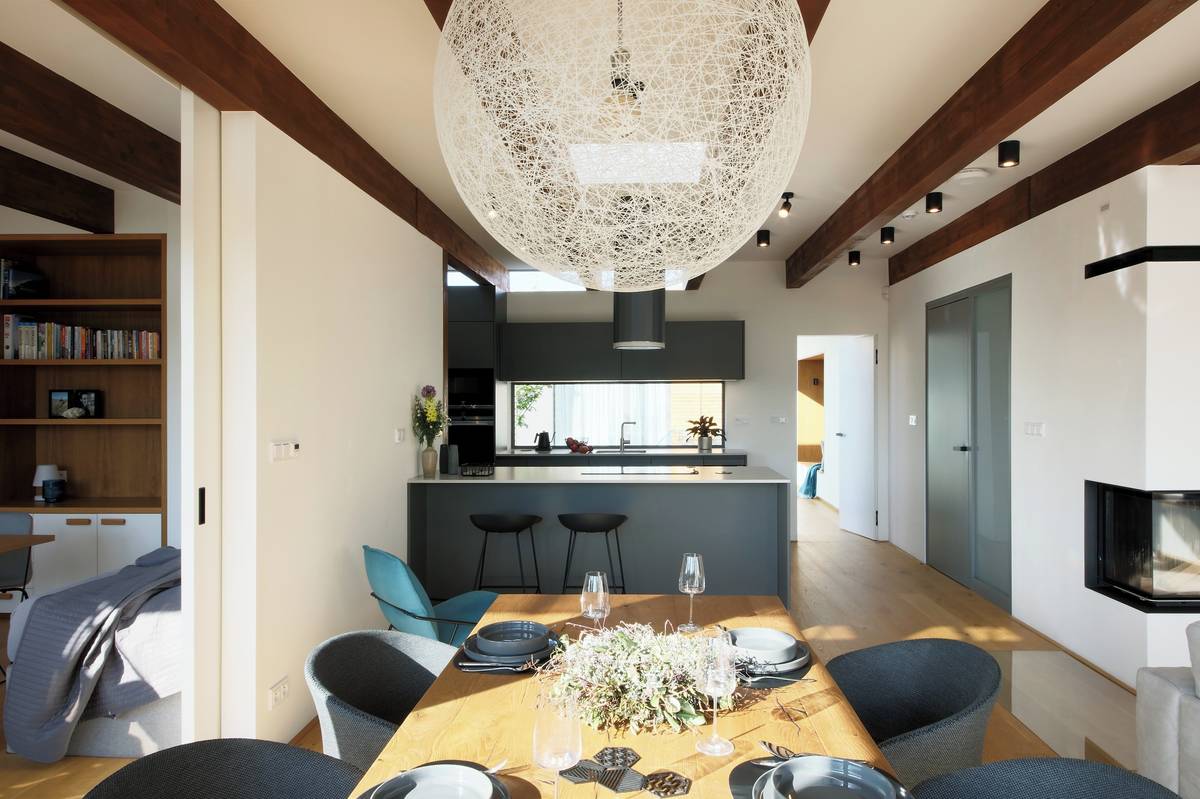 Pohled z kuchyně vede na celý obytný prostor a dále do atria.