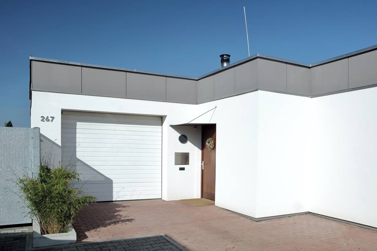 Bíle omítnutá střecha s pásem z šedých cementovláknitých desek je rys, který se opakuje v celé ulici.