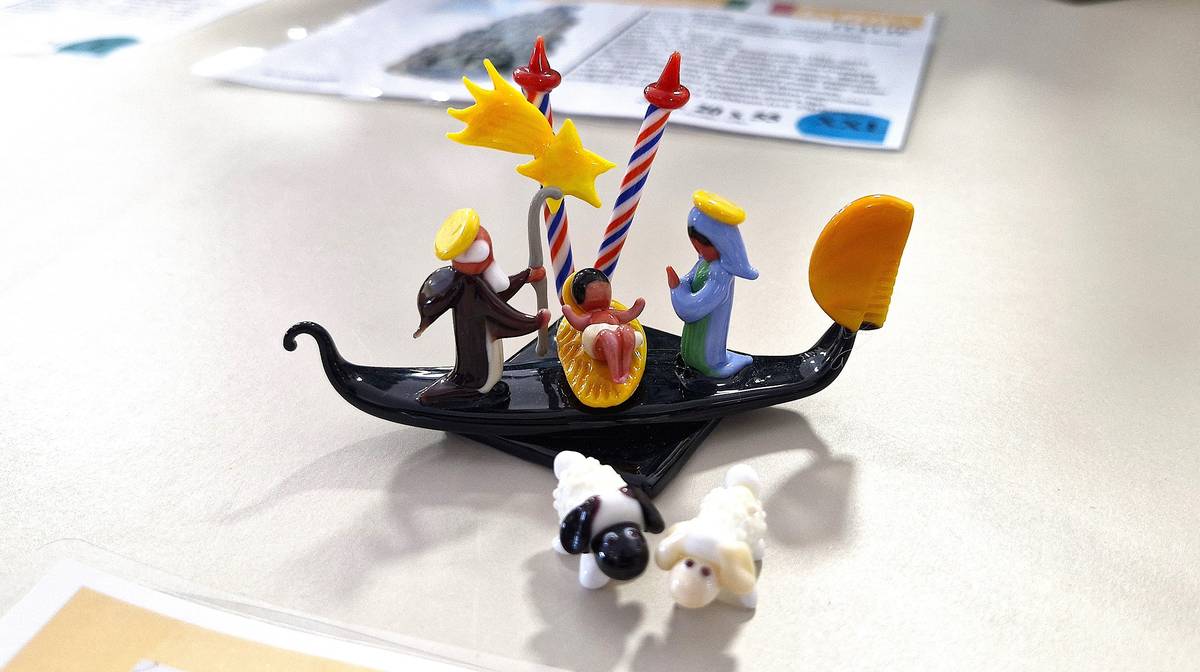 Z benátského ostrova Murano pochází tento skleněný betlém s tradiční gondolou.