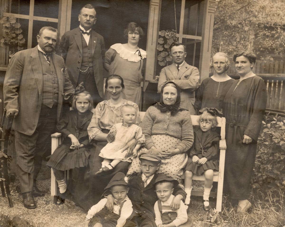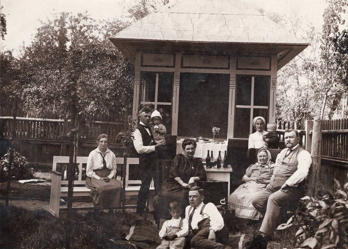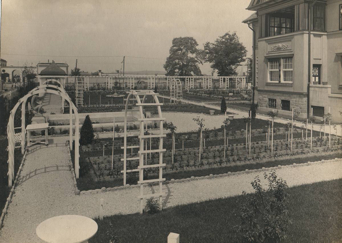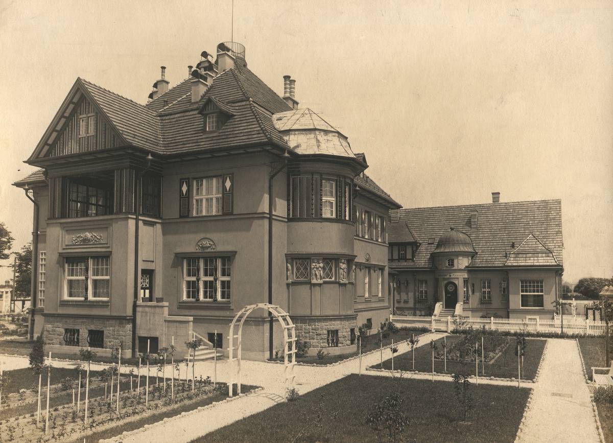 Grossmannova vila – historické foto, vlevo ozdobná zeď, vzadu vchod do domu, garáž a úřednický dům.