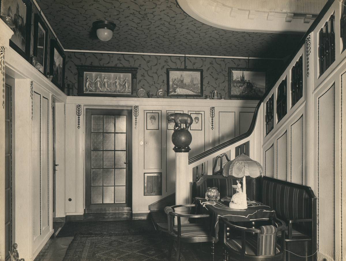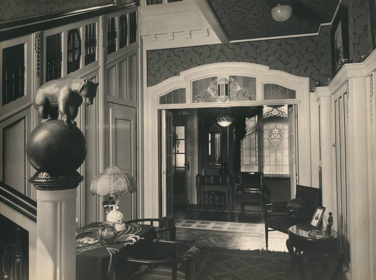 Grossmannova vila – historické foto, schodišťová hala v přízemí.