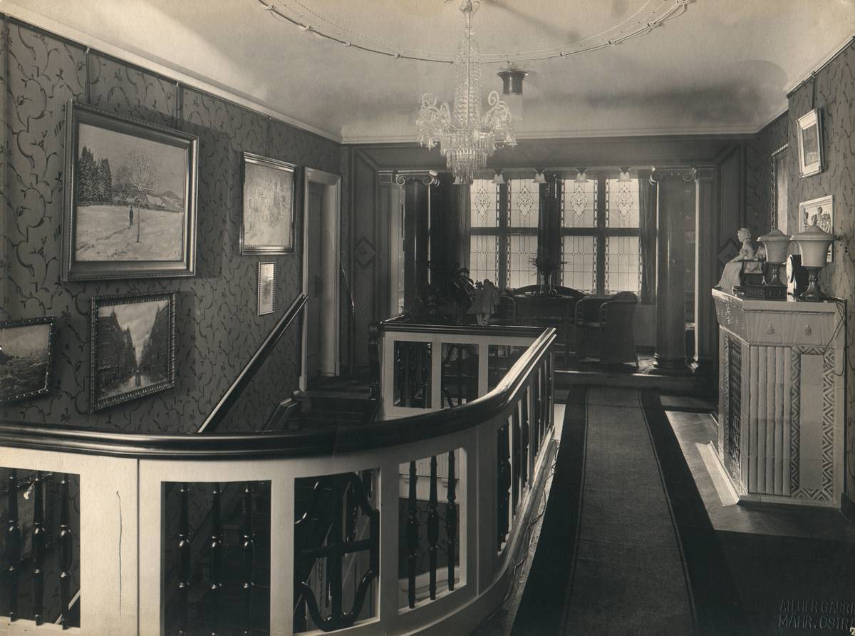 Grossmannova vila – historické foto, galerie nad schodištěm v prvním patře.