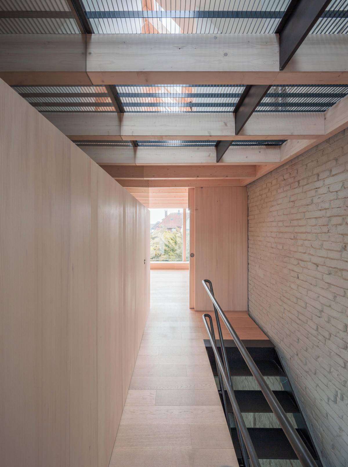 Schodiště ozvláštňuje přiznané cihloví.