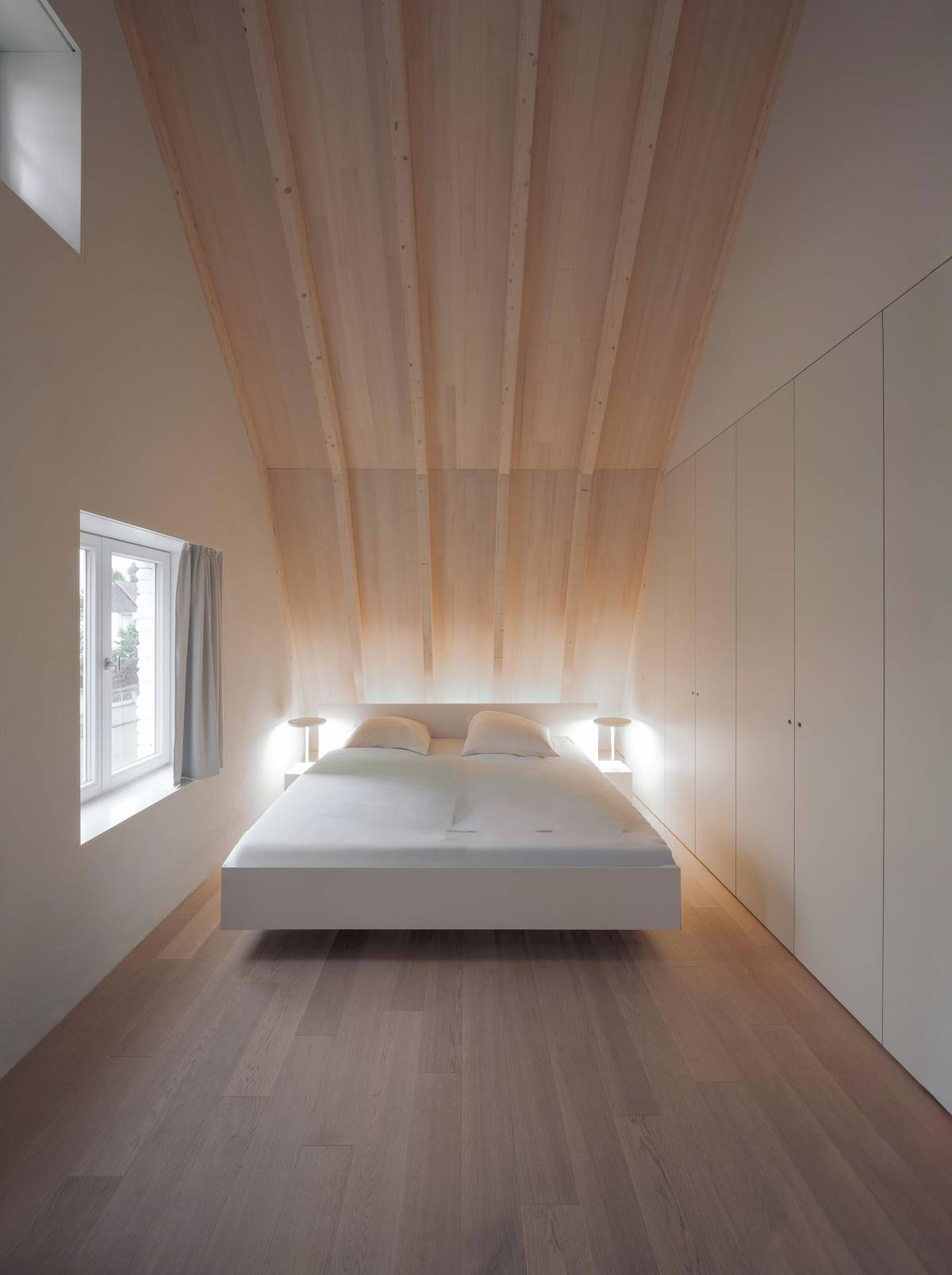 Ložnice je prosvětlena jemnými barvami.