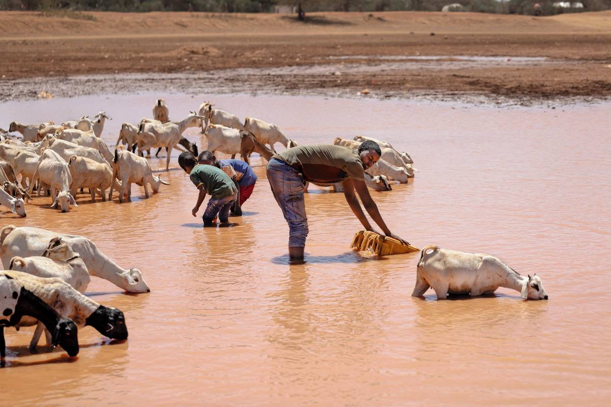 Stáda koz, skotu a velbloudů nyní musí putovat až 30 kilometrů k nejbližšímu napajedlu ve vesnici Lulis, kde zvířata i lidé čekají na zbývající vodu, kterou úřady rozdělují na příděl. (Muž nabírá vodu do kanystrů pro domácí použití z rychle vysychajícího vodního zdroje ve vesnici Lulis, 20. ledna.)
