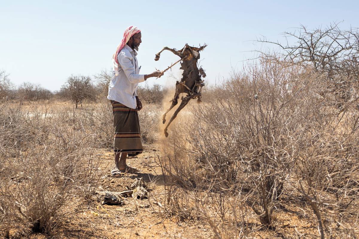 V nedalekém městě Banissa se nachází umělé napajedlo. Kdysi pojalo 60 tisíc kubických metrů vody, dnes je z něj pustá plocha. (Abdirizak Gabow sbírá v obci Hawara uhynulé kozy, aby je později z hygienických důvodů spálil, 21. ledna.)