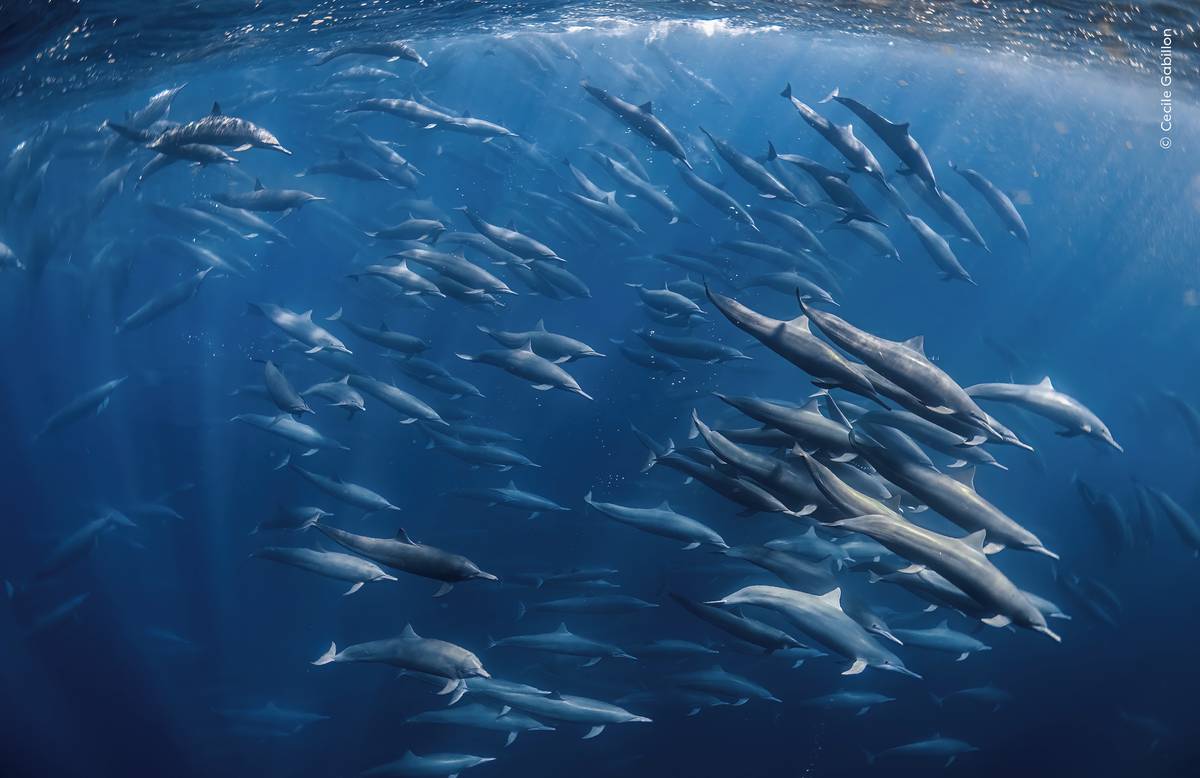 Velkolepé stádo delfínů skákavých při lovu. Vyfotila Cecile Gabillon.