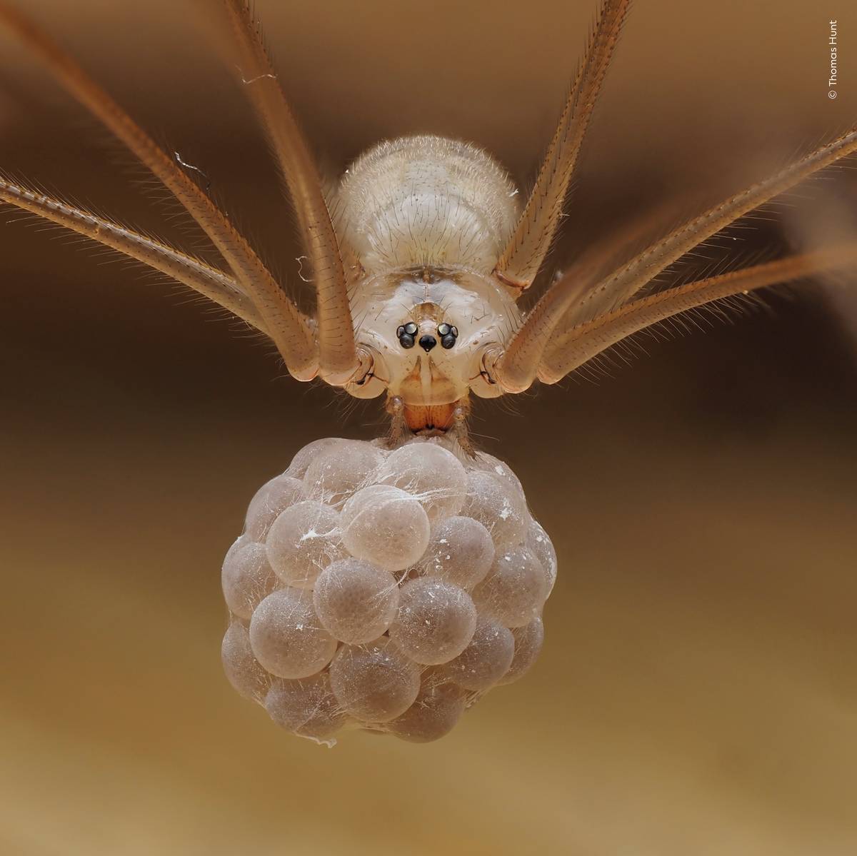 Pavouk z čeledi třesavkovití nese v tlamě klubko vajíček. Vyfotil Thomas Hunt.