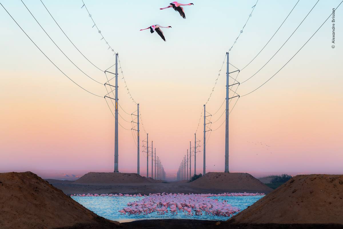 Hejno plameňáků u elektrického vedení. Po deseti hodinách jízdy dorazil Alexandre Brisson do ptačí rezervace ve Walvis Bay v Namibii v okamžiku, kdy zapadalo slunce. Zápach z nedaleké skládky prý byl nesnesitelný a ostře kontrastoval s krásou opeřenců.