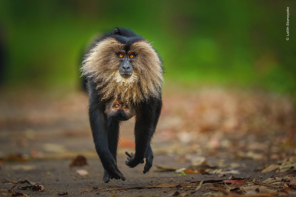 Samice makaka lvího běží s mládětem. Vyfotil Lalith Ekanayake.
