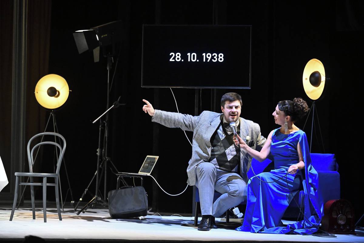 Lukáš Matěj jako Jan Ryba a Tereza Novotná v roli moderátorky.