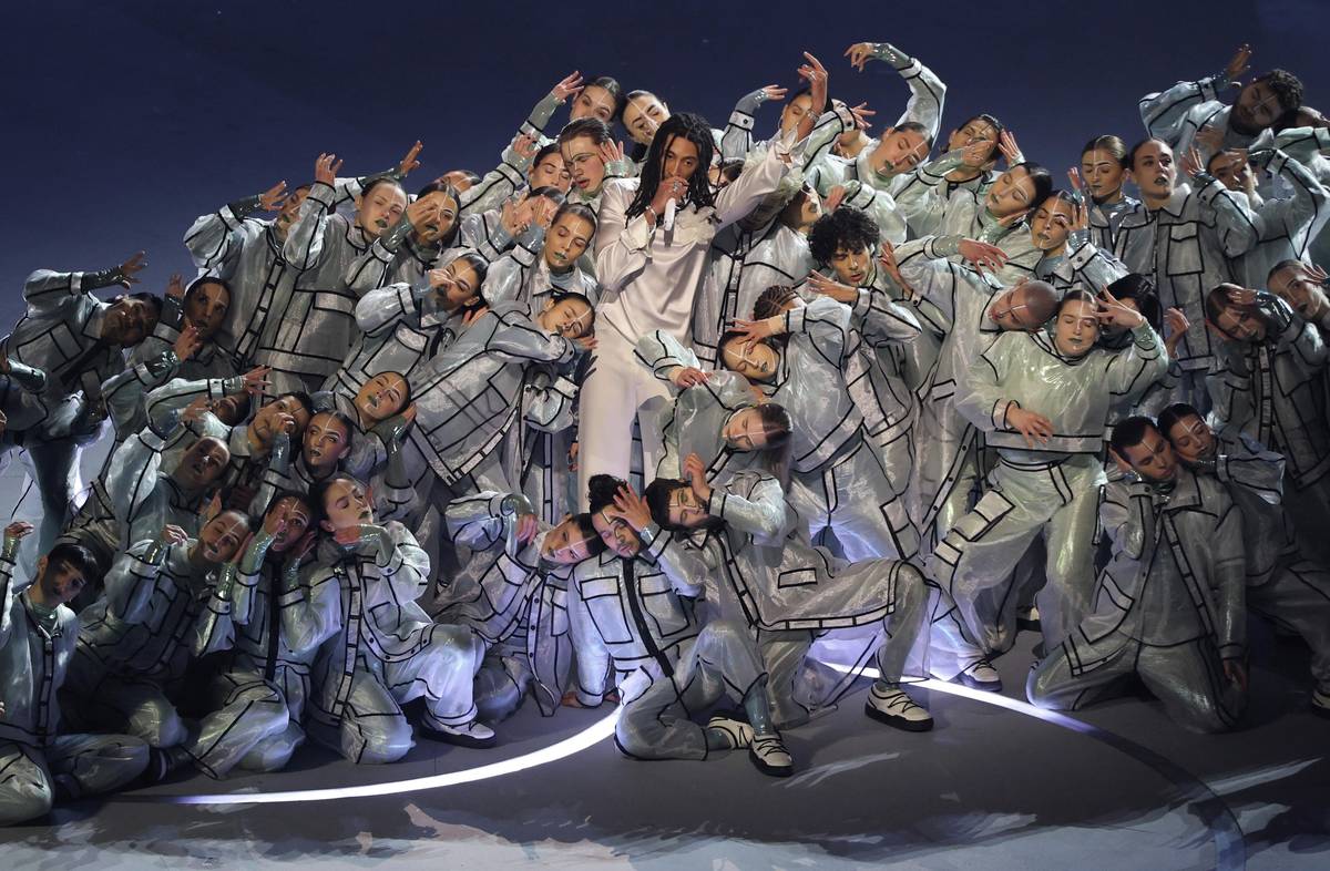 Italská hymna v podání Laury Pausini. Kulisou byly kostýmy načrtnuté Giorgiem Armanim.
