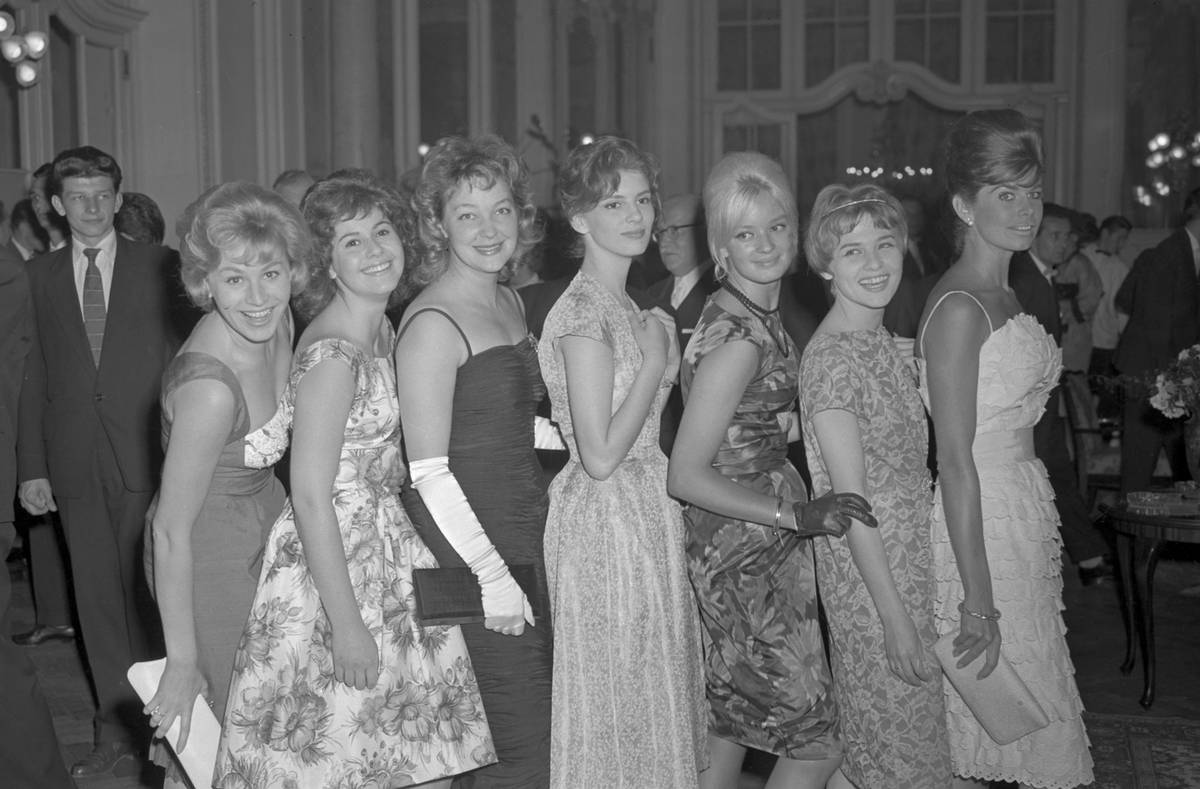 XII. Mezinárodní filmový festival Karlovy Vary, 24. července 1960. Zleva herečky Waltraut Haasová (Rakousko), Jana Kasanová (ČSSR), Irina Skobcevová (SSSR), Irina Petrescu (Rumunsko), Jana Brejchová (ČSSR), Marika Töröcsiková (Maďarsko) a argentinská herečka Kislingová.