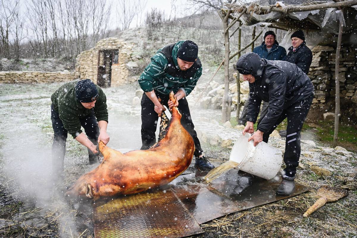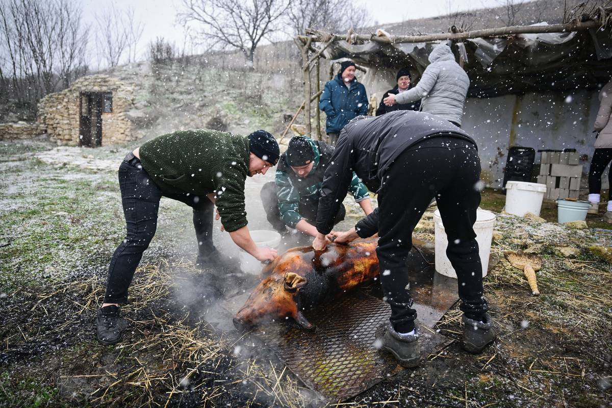 Takové zvyky jsou jinde „těžko k vidění“, prohlásil dvaadvacetiletý I Sang-kjong, jenž vypadal ohromeně, když ze sena pokrývajícího prase stoupal kouř, zatímco kolem padal sníh.
